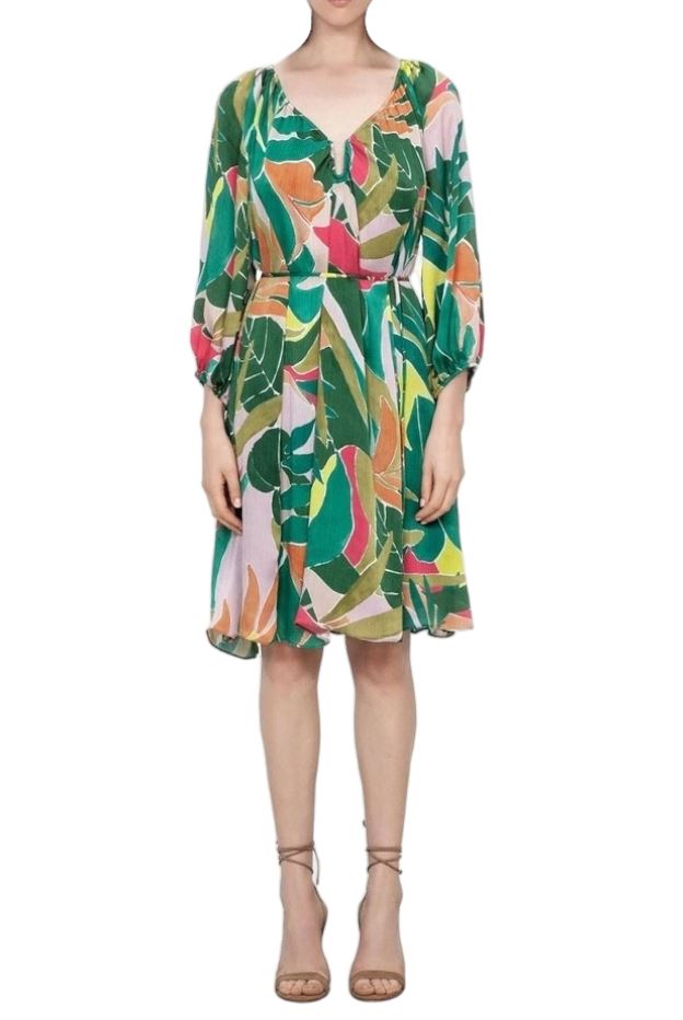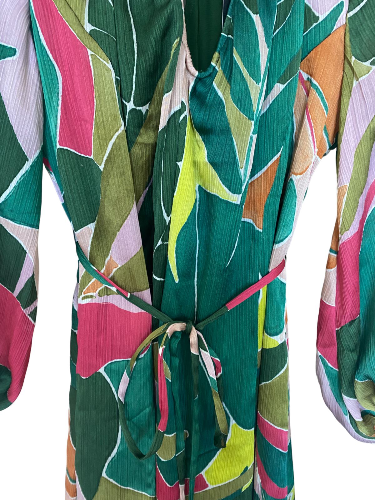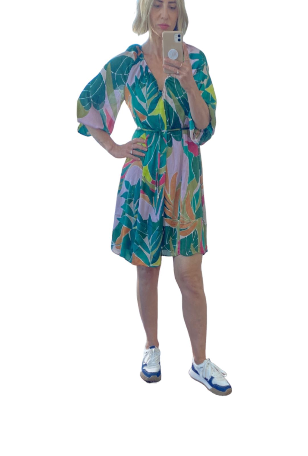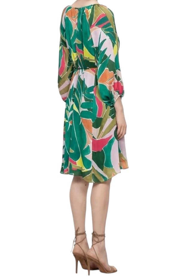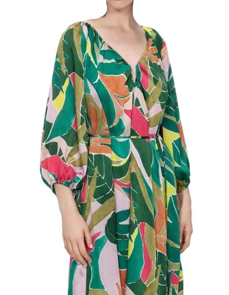 It features a lightweight and drapey dress that is loose and comfortable. It is crafted from a crinkle georgette material and is a bright 'Daintree' print. It is a great dress that suits transitions from day to evening in the same outfit. It would look beautiful when paired with gold jewellery and strappy sandals.