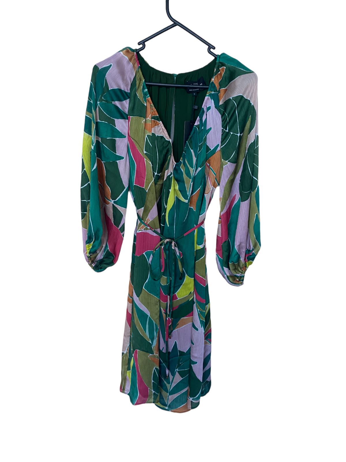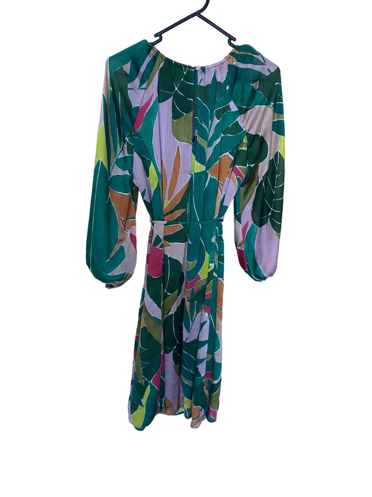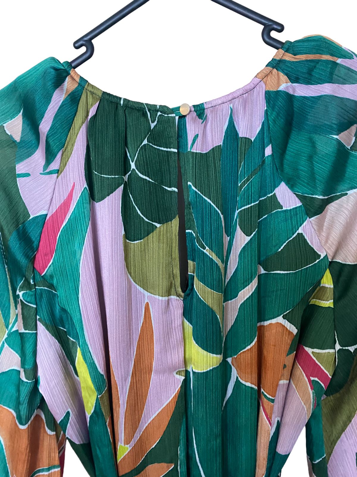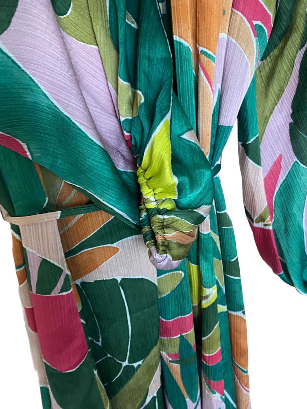 It features a lightweight and drapey dress that is loose and comfortable. It is crafted from a crinkle georgette material and is a bright 'Daintree' print. It is a great dress that suits transitions from day to evening in the same outfit. It would look beautiful when paired with gold jewellery and strappy sandals.