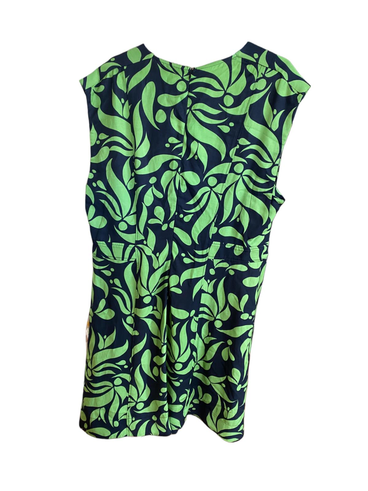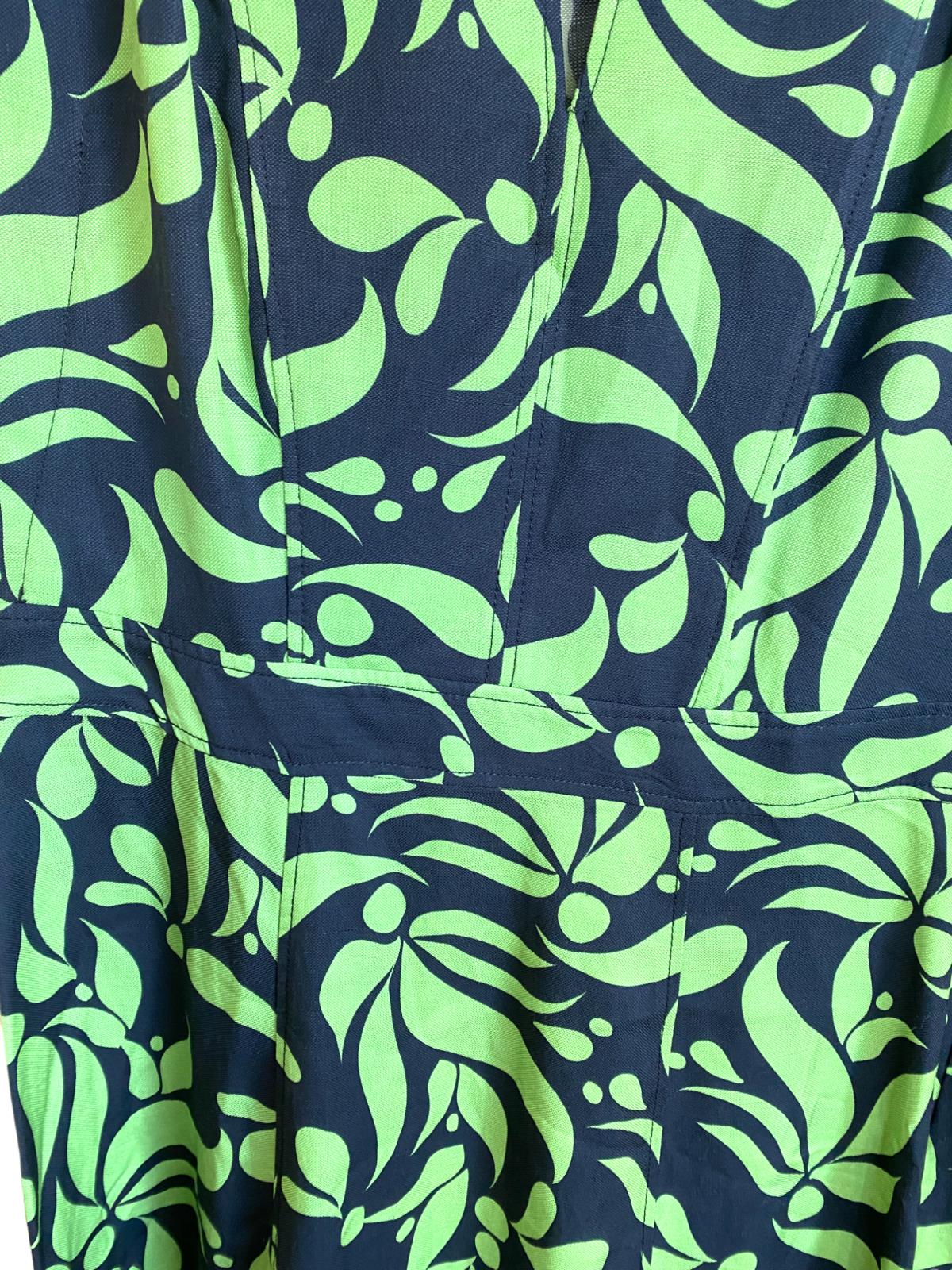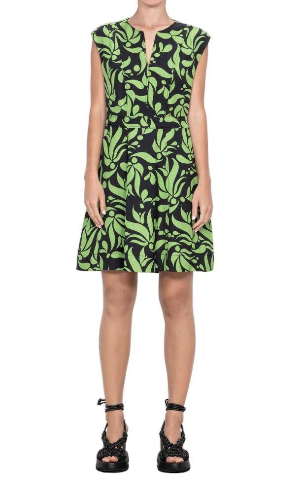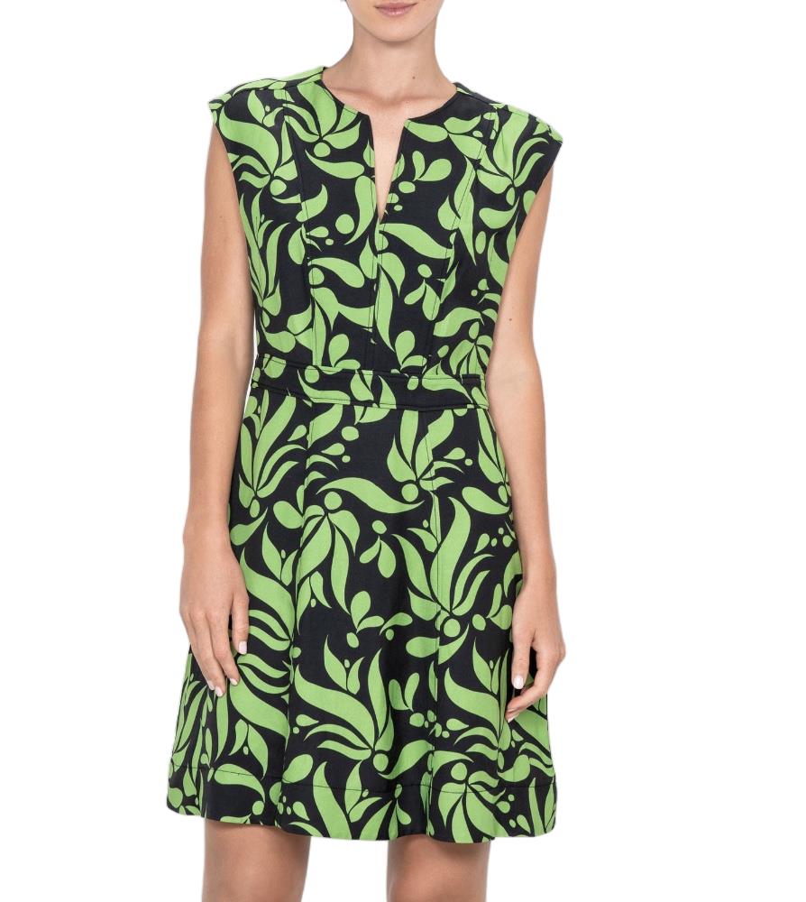This is a gorgeous dress by the sustainable brand Veronika Maine. The dress features a lime green and black deco print throughout. It is a sleeveless style and is sure to be an effortless option to wxear on summer days. The dress is cut wth a tunic-style neckline, it skims the waist and falls to an A-line shape above the knees.