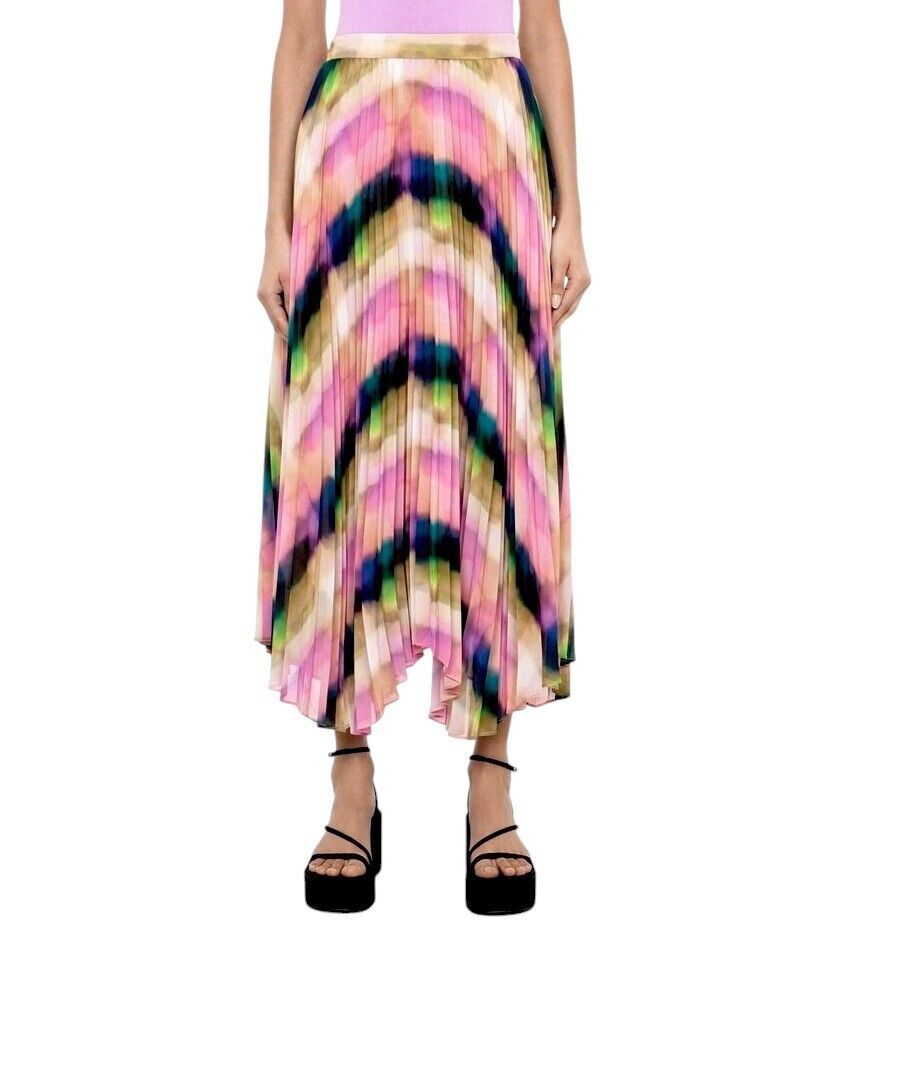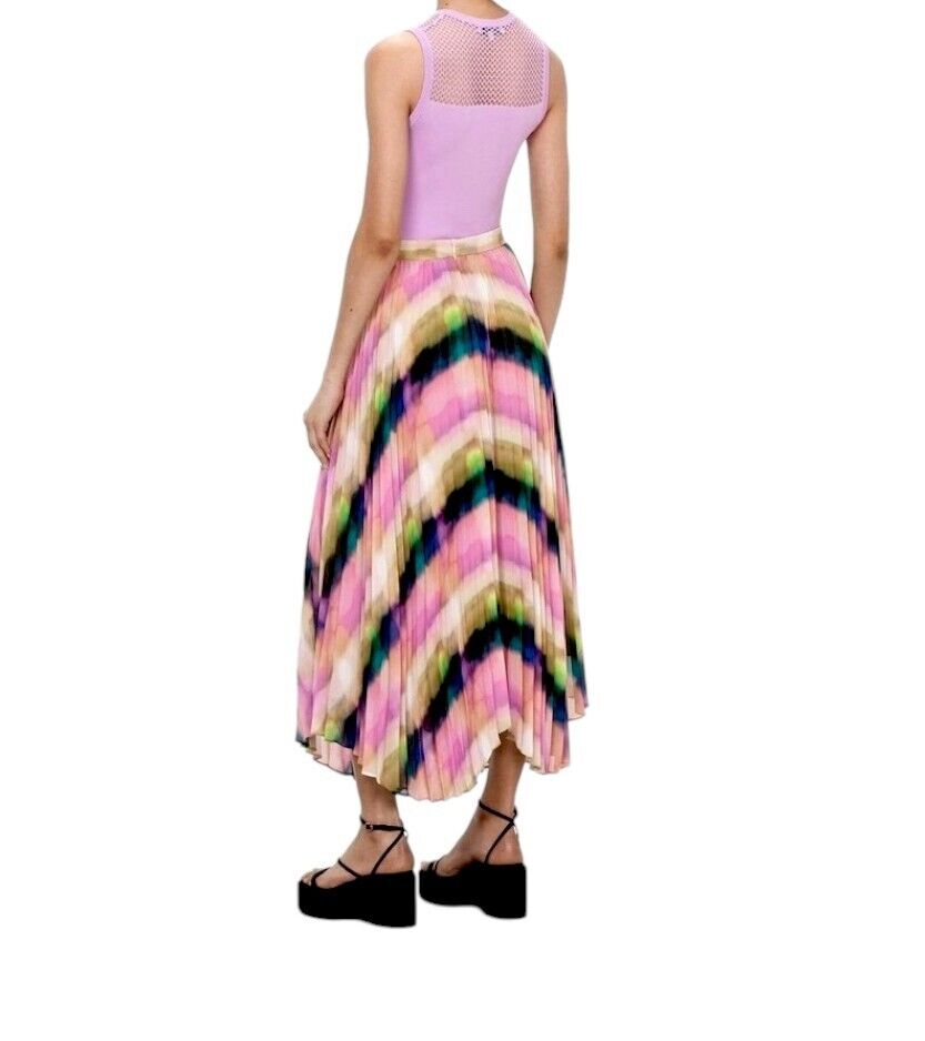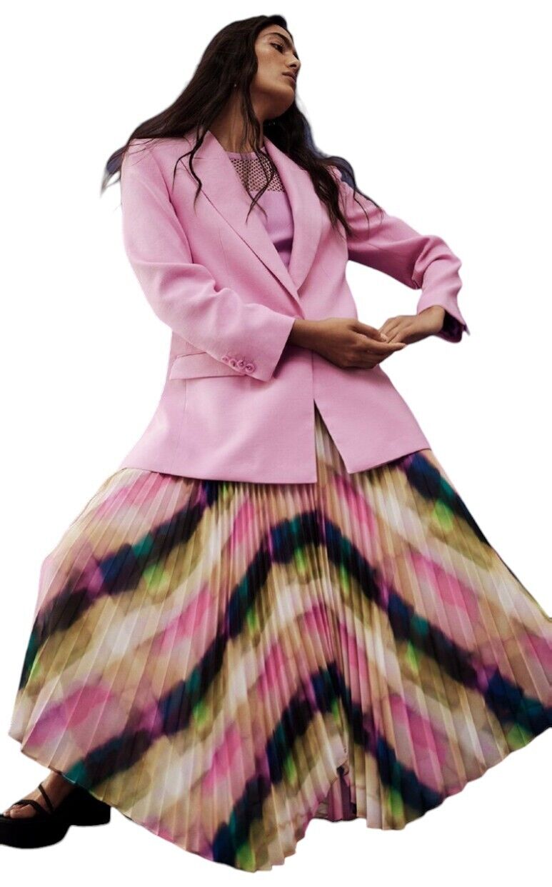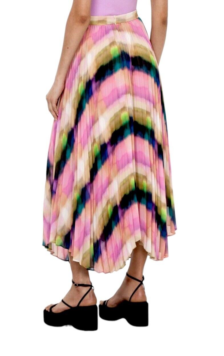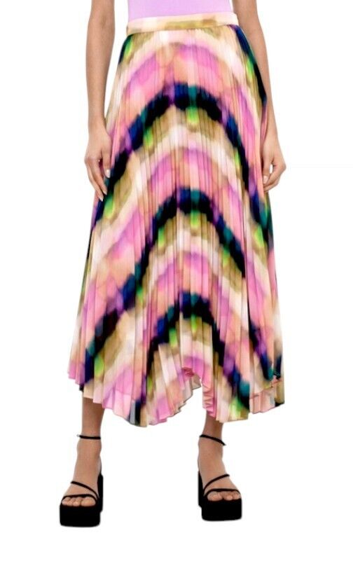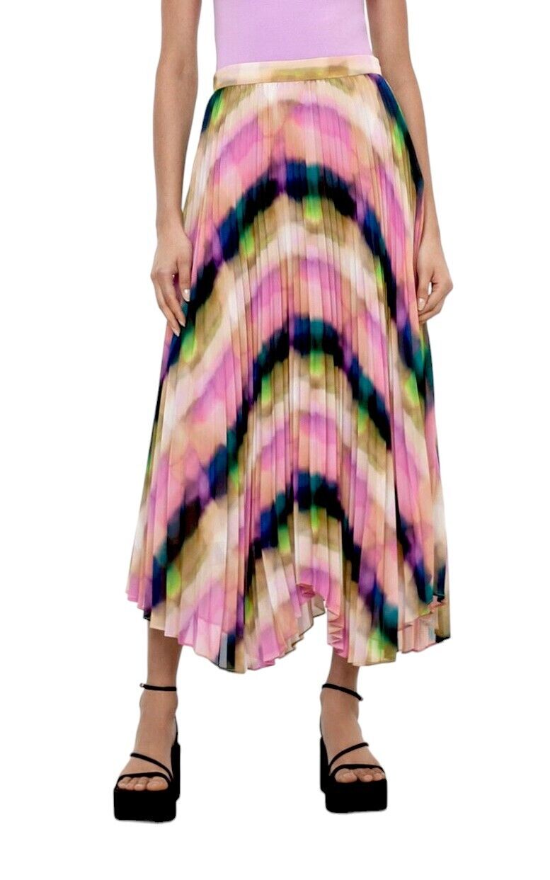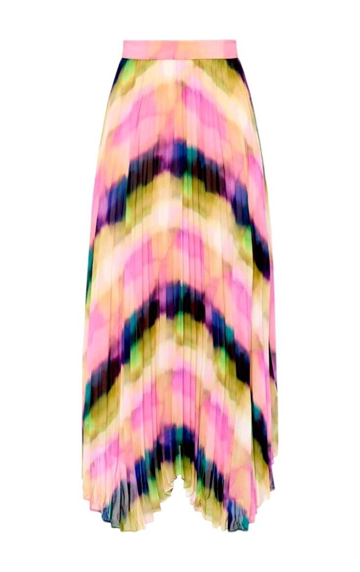 This is a gorgeous, vibrant skirt by Veronika Maine from their Summer 2023 collection. It features a flowing, pleated skirt made out of a fluid chiffon. The print is an exclusive Veronika Maine Murano check. The skirt is soft and very movable with accordion pleating throughout. Both comfortable, effortless, vibrant and swirling, it is bound to be the colourful favourite this season.