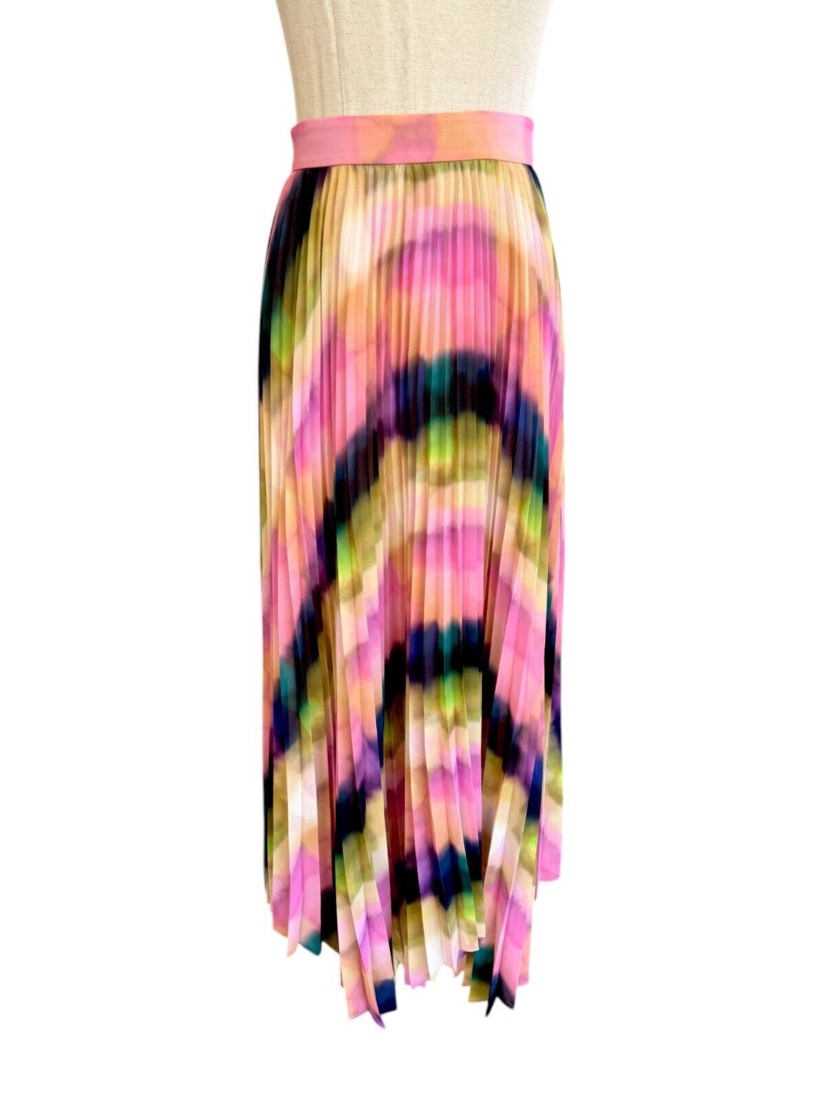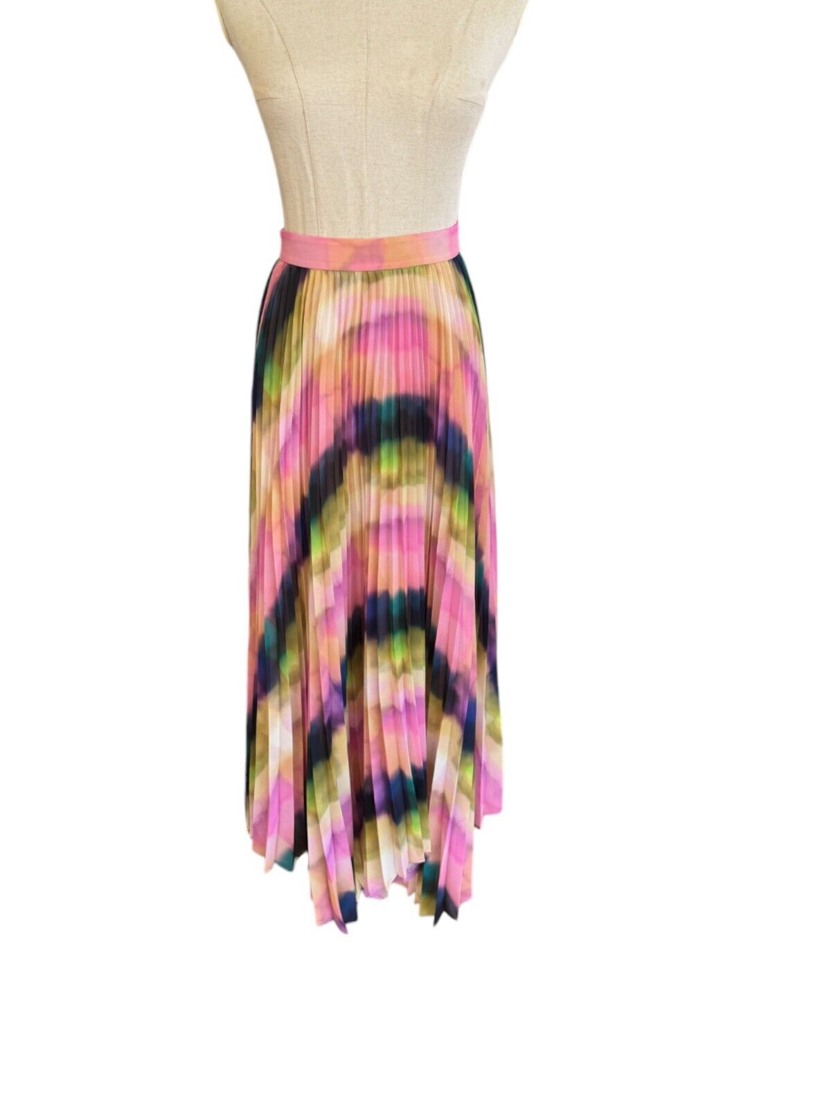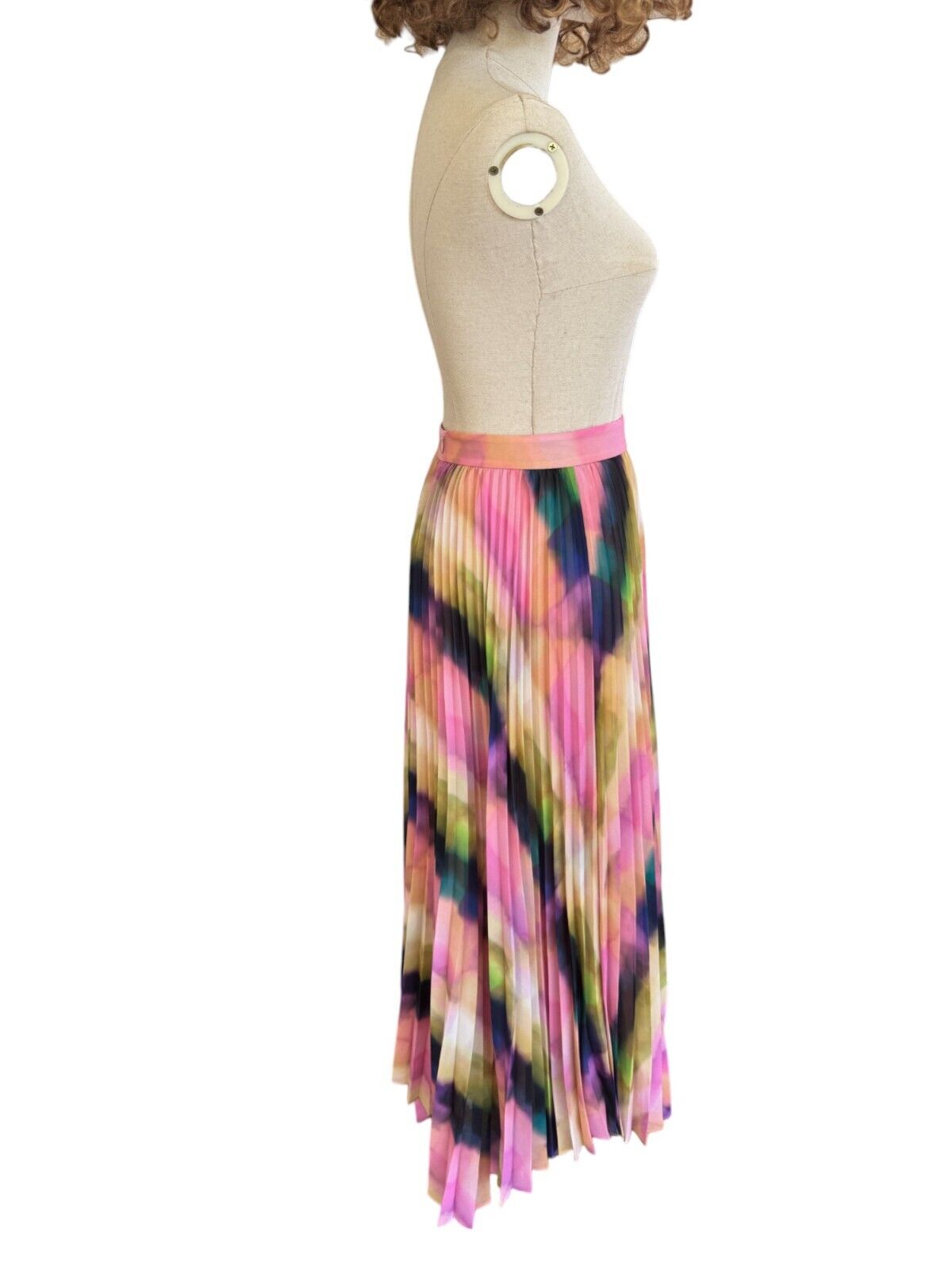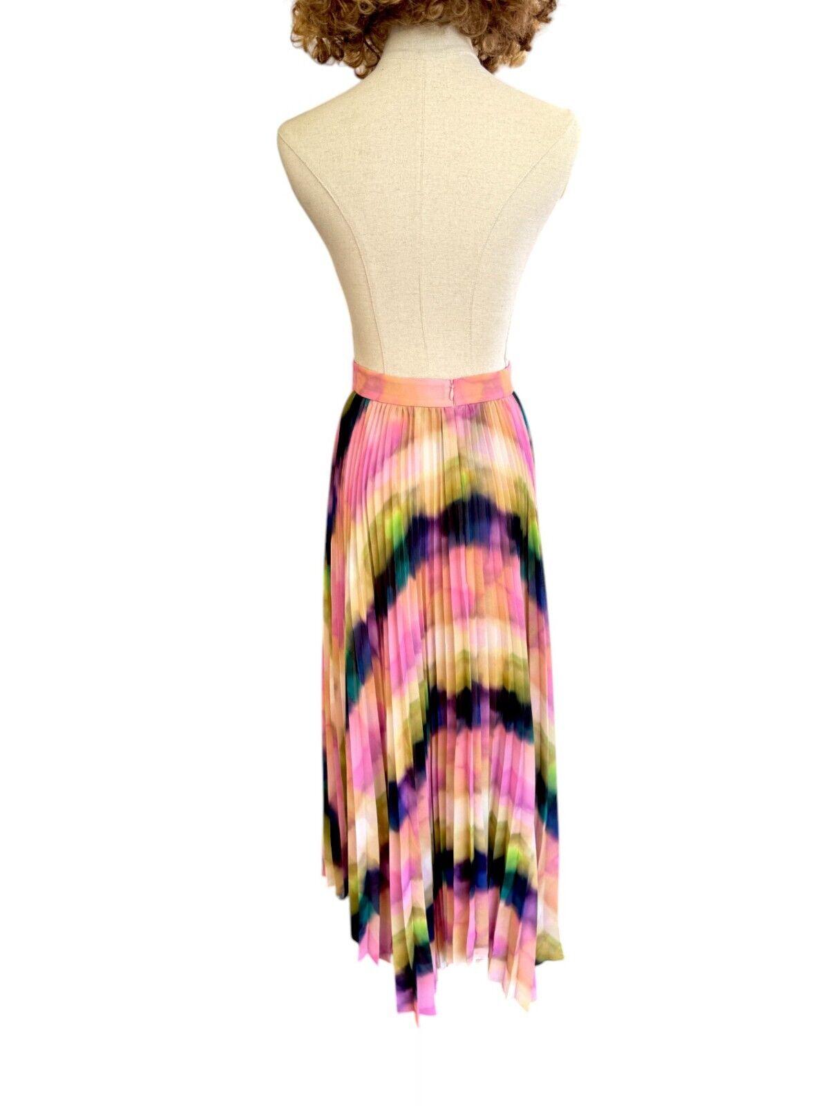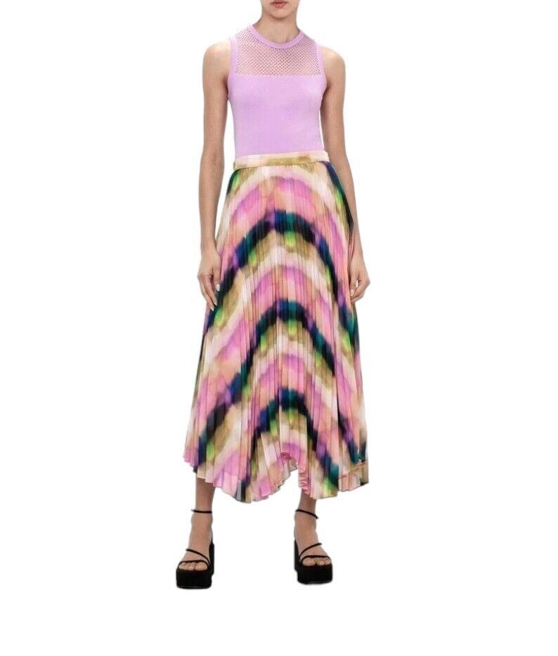 This is a gorgeous, vibrant skirt by Veronika Maine from their Summer 2023 collection. It features a flowing, pleated skirt made out of a fluid chiffon. The print is an exclusive Veronika Maine Murano check. The skirt is soft and very movable with accordion pleating throughout. Both comfortable, effortless, vibrant and swirling, it is bound to be the colourful favourite this season.