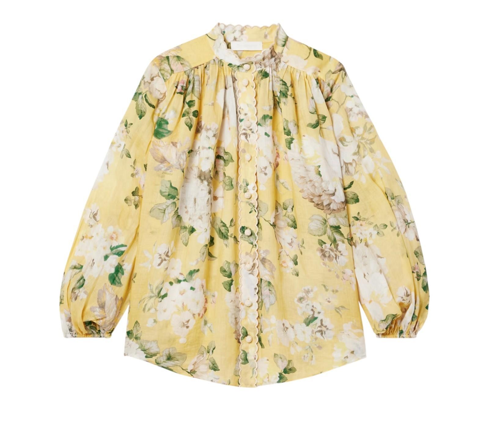 Zimmermann Acacia Scallop Blouse | Yellow Floral, Ramie, Dolman Long Sleeves