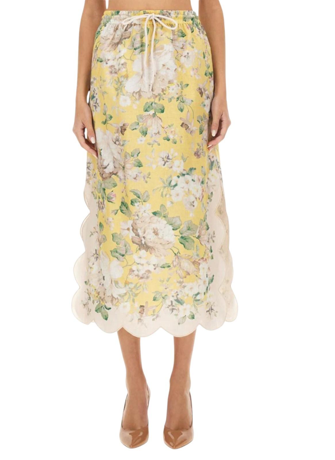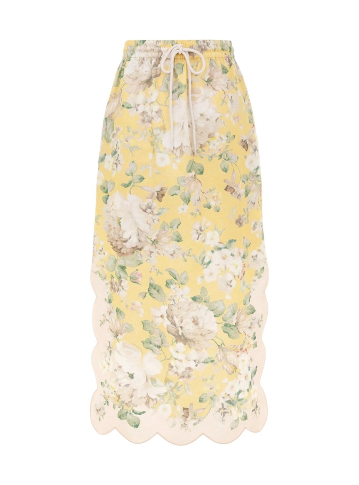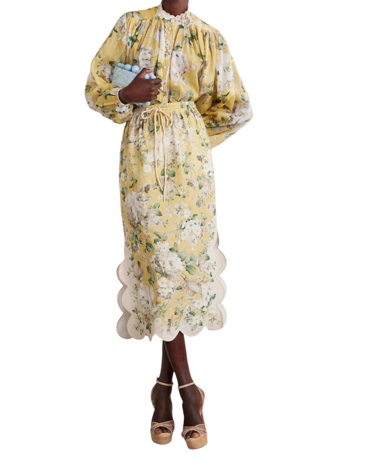 Zimmermann Acacia Scallop midi skirt |Yellow /White Floral, Elastic Waist, Linen