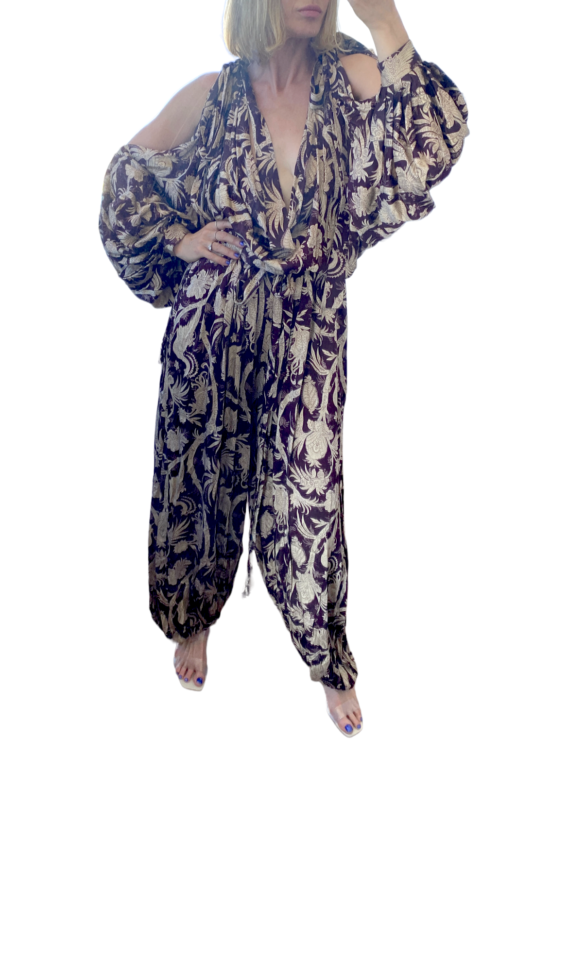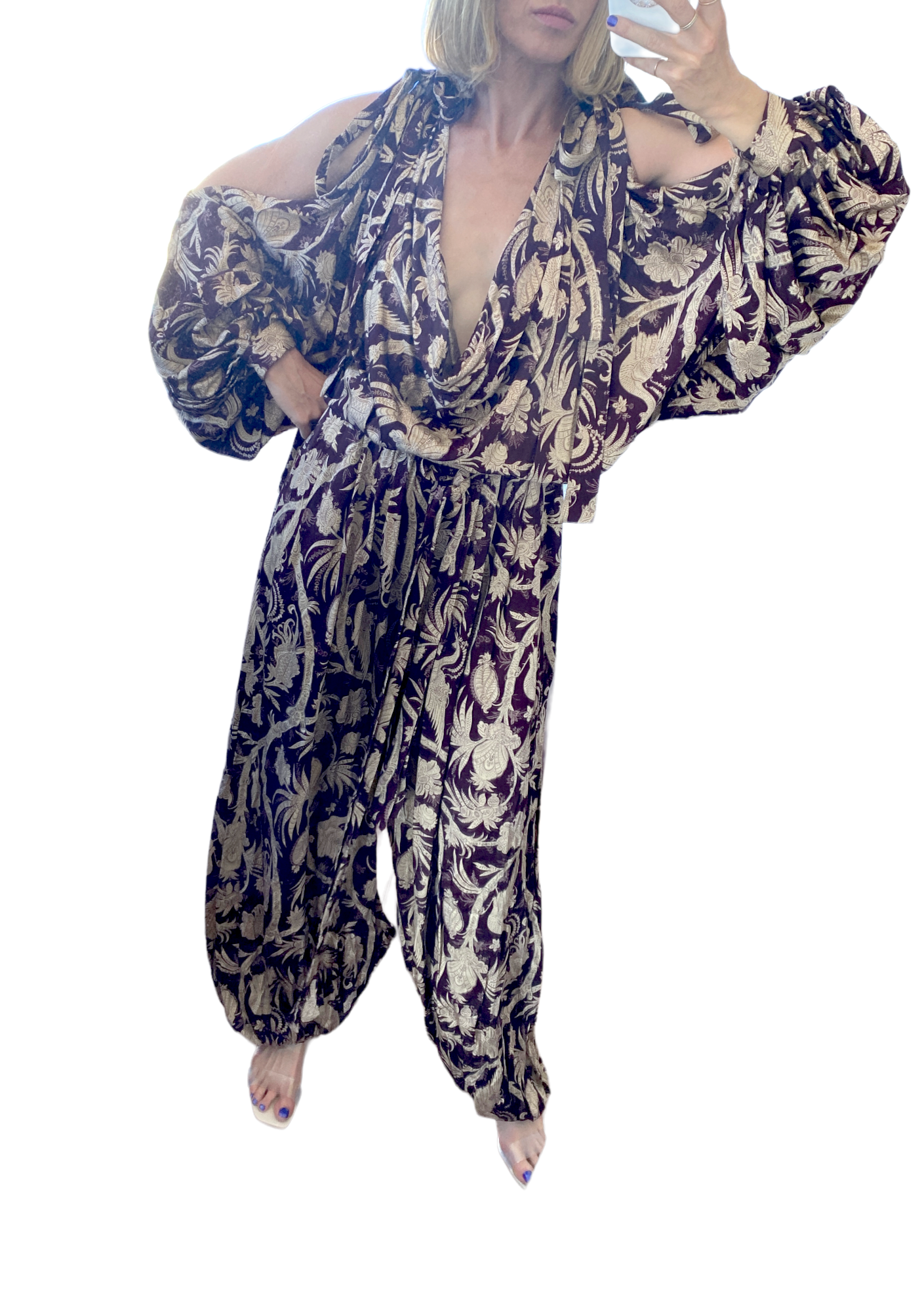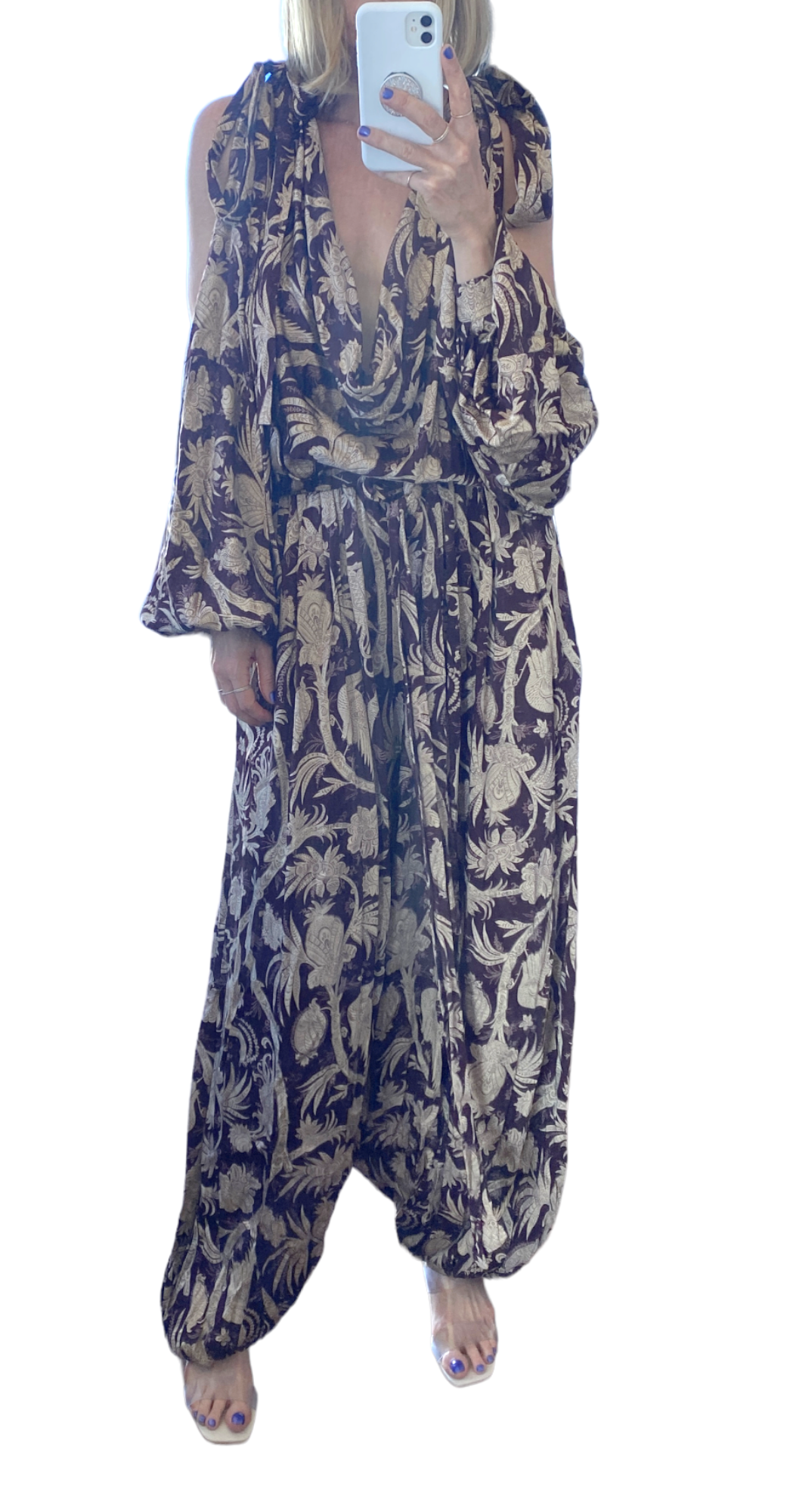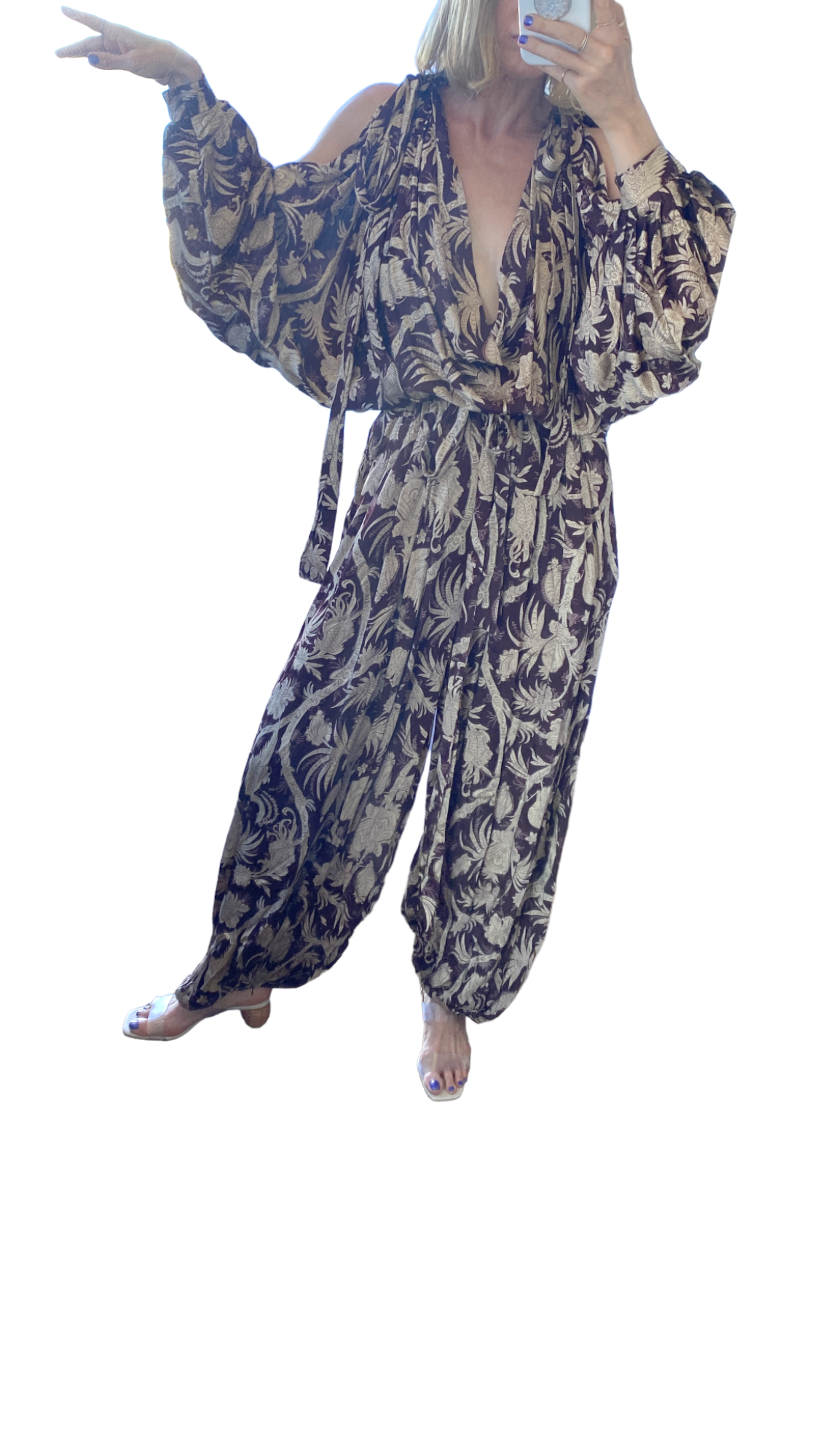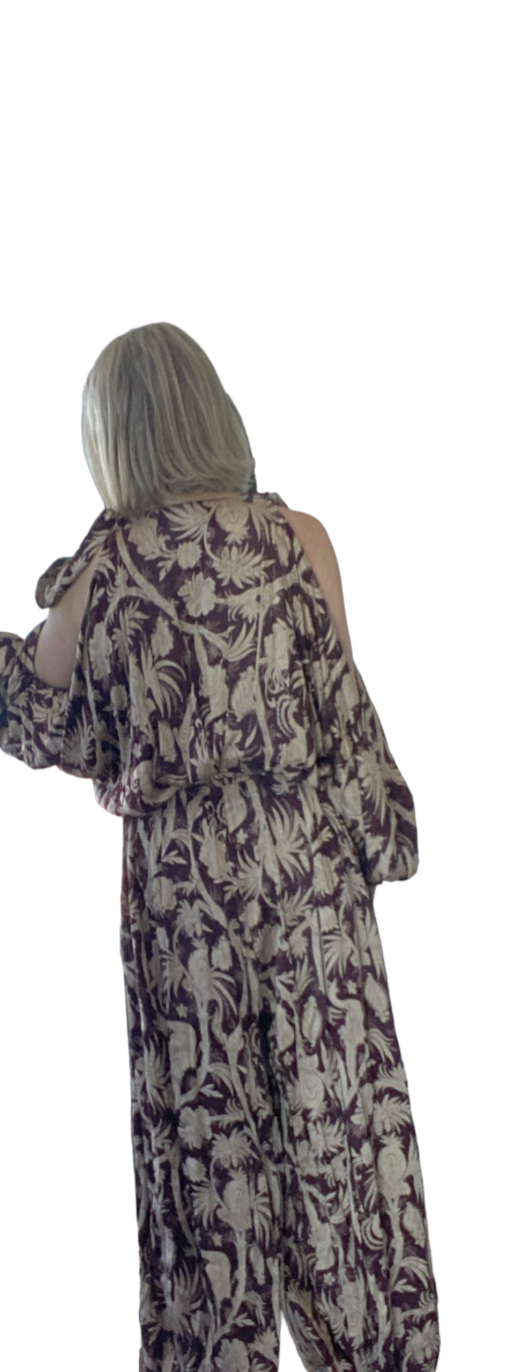 This jumpsuit was from their high end Karmic collection and now available on Naked Pear for much less than even a quarter of its original price. From Zimmermann's Fall 16 collection, in Burgundy Bird Chintz. Cold shoulder jumpsuit with front cowl neckline and shoulder ties. Blouson cuffed sleeves, elasticated waist with self tie belt. Harem style pant with cuffs and side seam pockets at hip. Cut out detail at shoulders