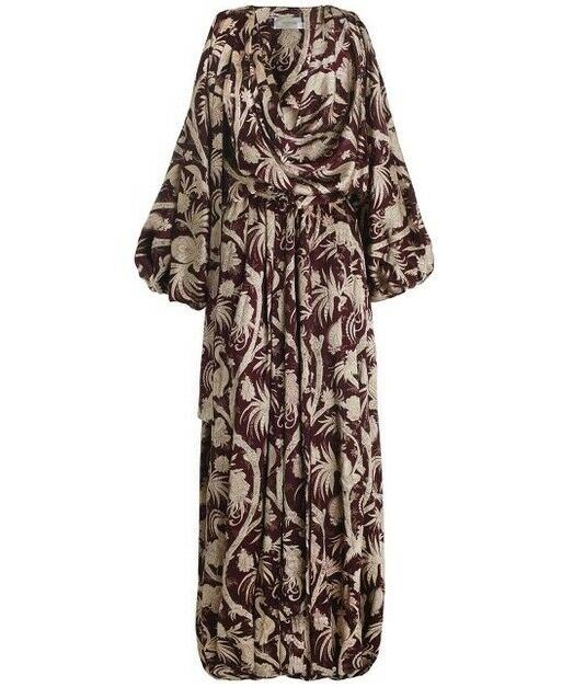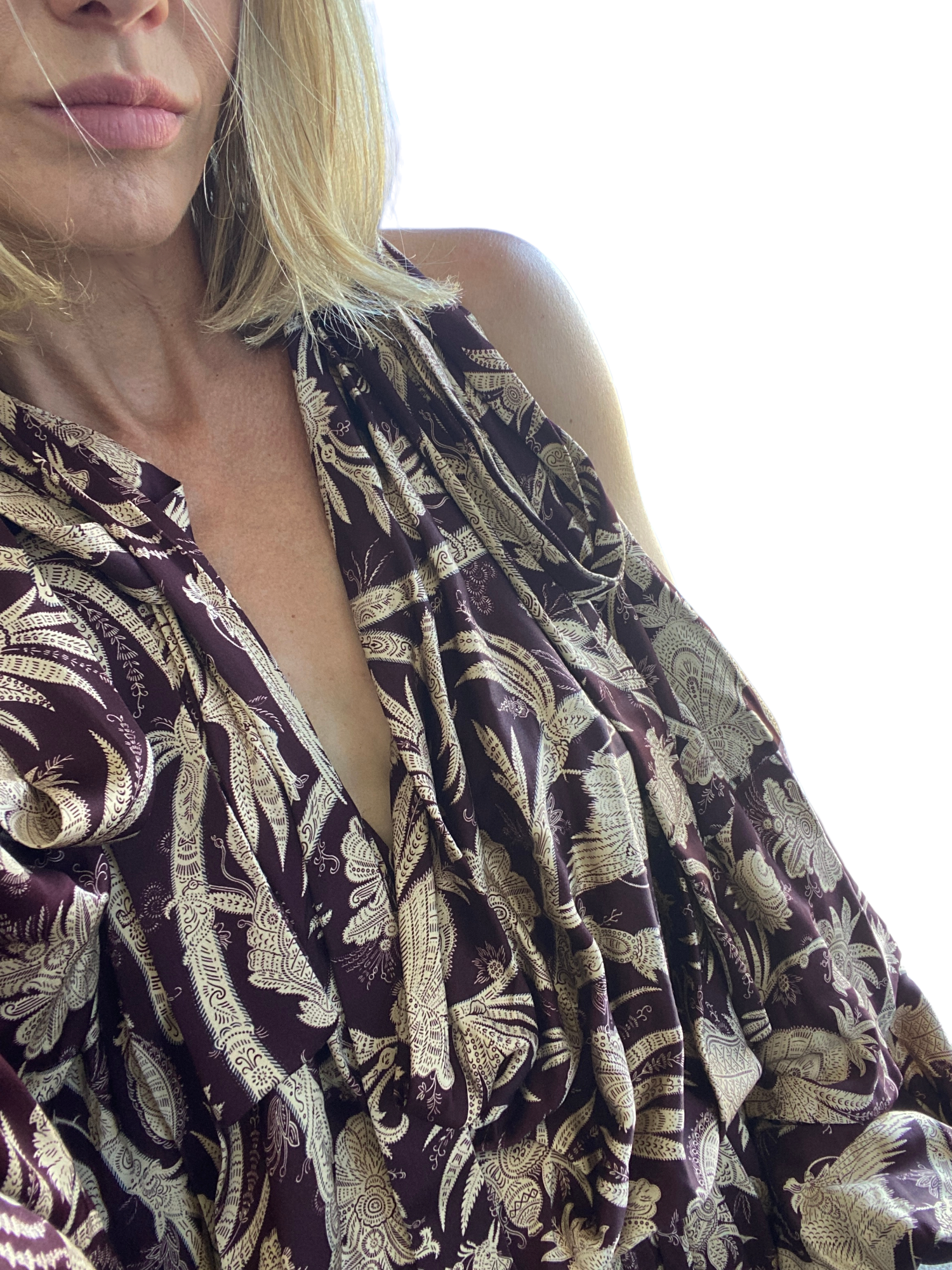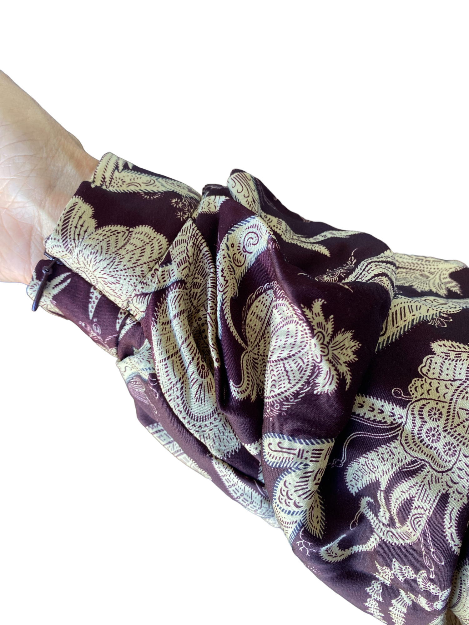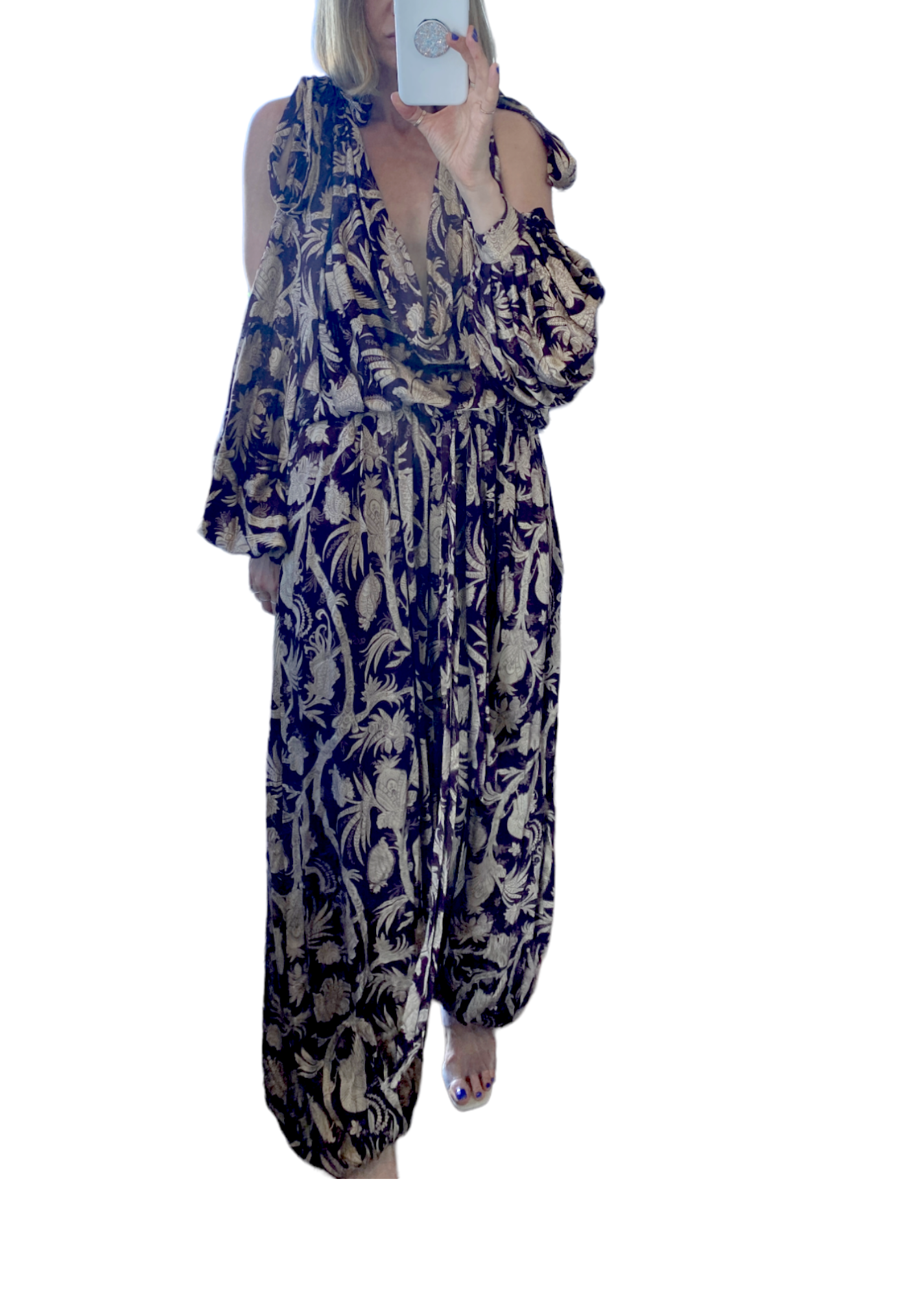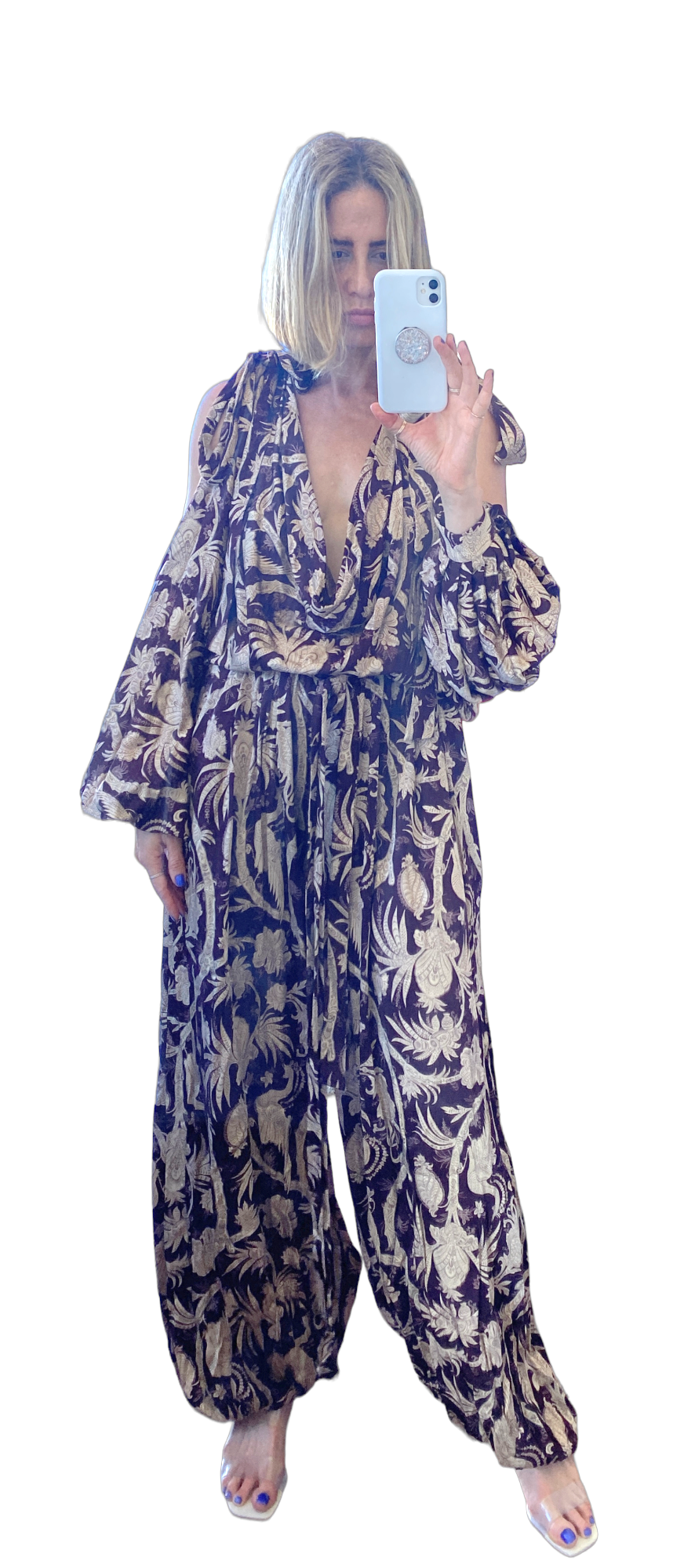 This jumpsuit was from their high end Karmic collection and now available on Naked Pear for much less than even a quarter of its original price. From Zimmermann's Fall 16 collection, in Burgundy Bird Chintz. Cold shoulder jumpsuit with front cowl neckline and shoulder ties. Blouson cuffed sleeves, elasticated waist with self tie belt. Harem style pant with cuffs and side seam pockets at hip. Cut out detail at shoulders