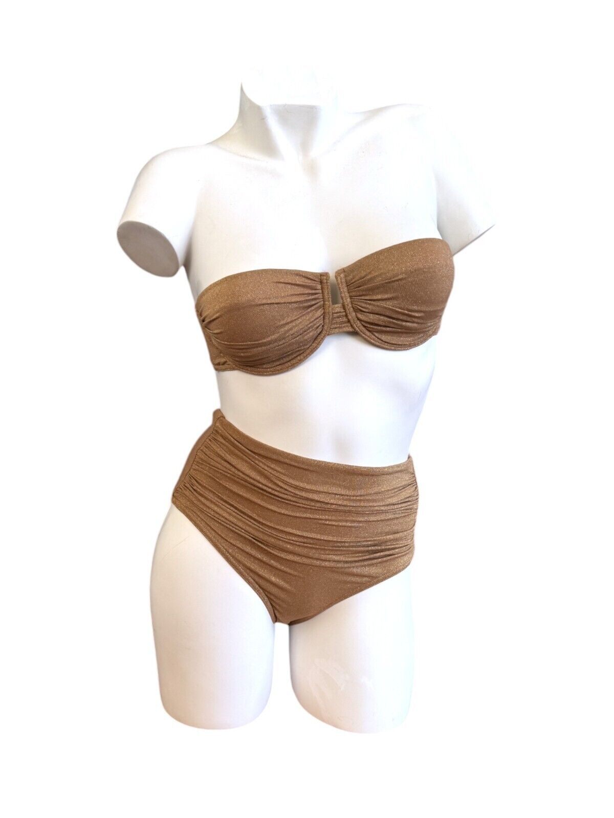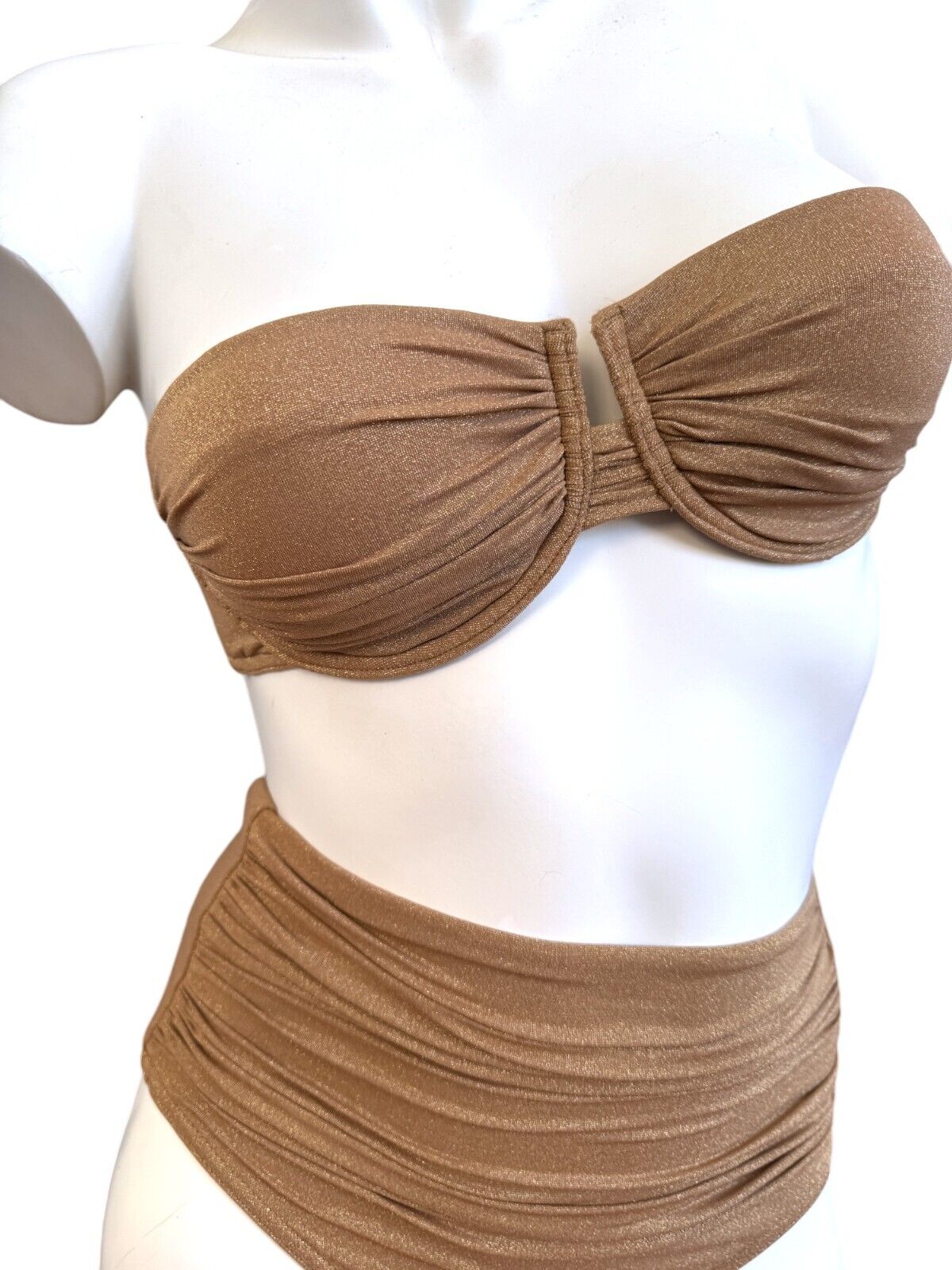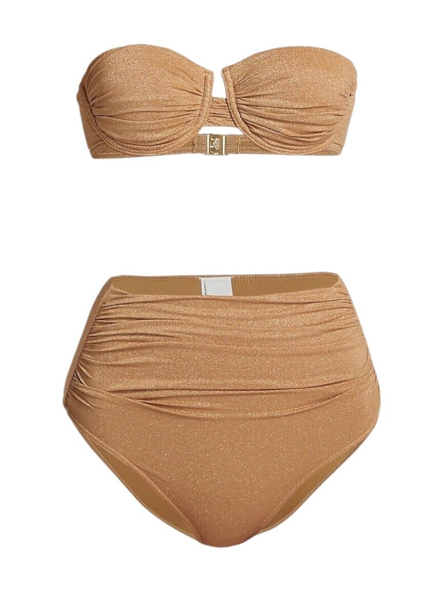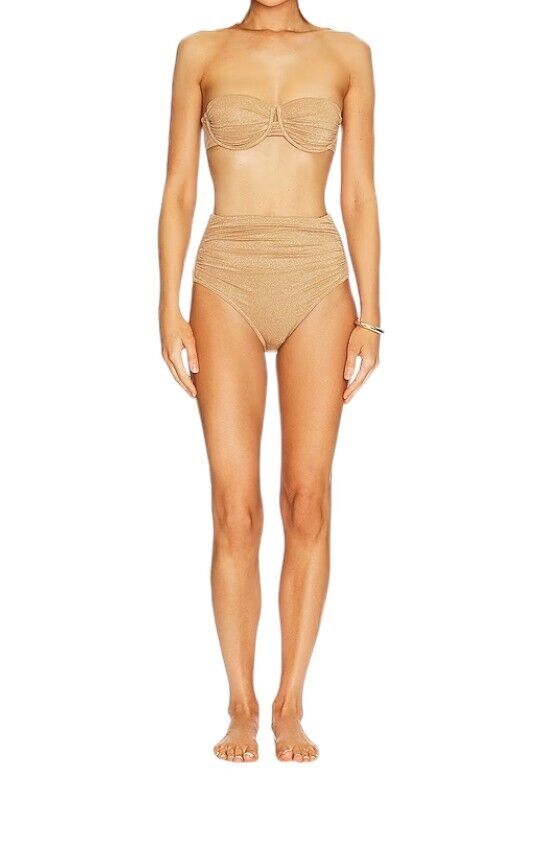 This is a lovely metallic gold bikini from Zimmermann's 2024 collection. It is designed with ruched details and a shimmery effect. The bikini is sold as a set and includes a strapless underwire top and high-rise bottoms.