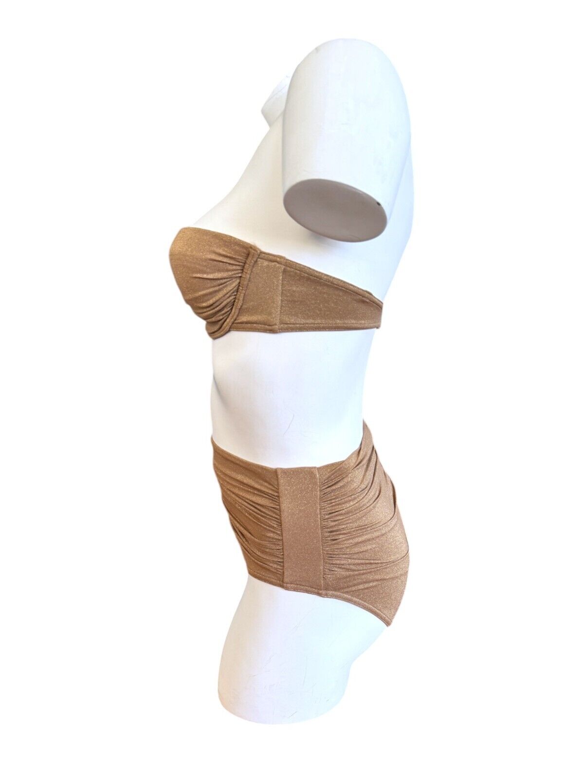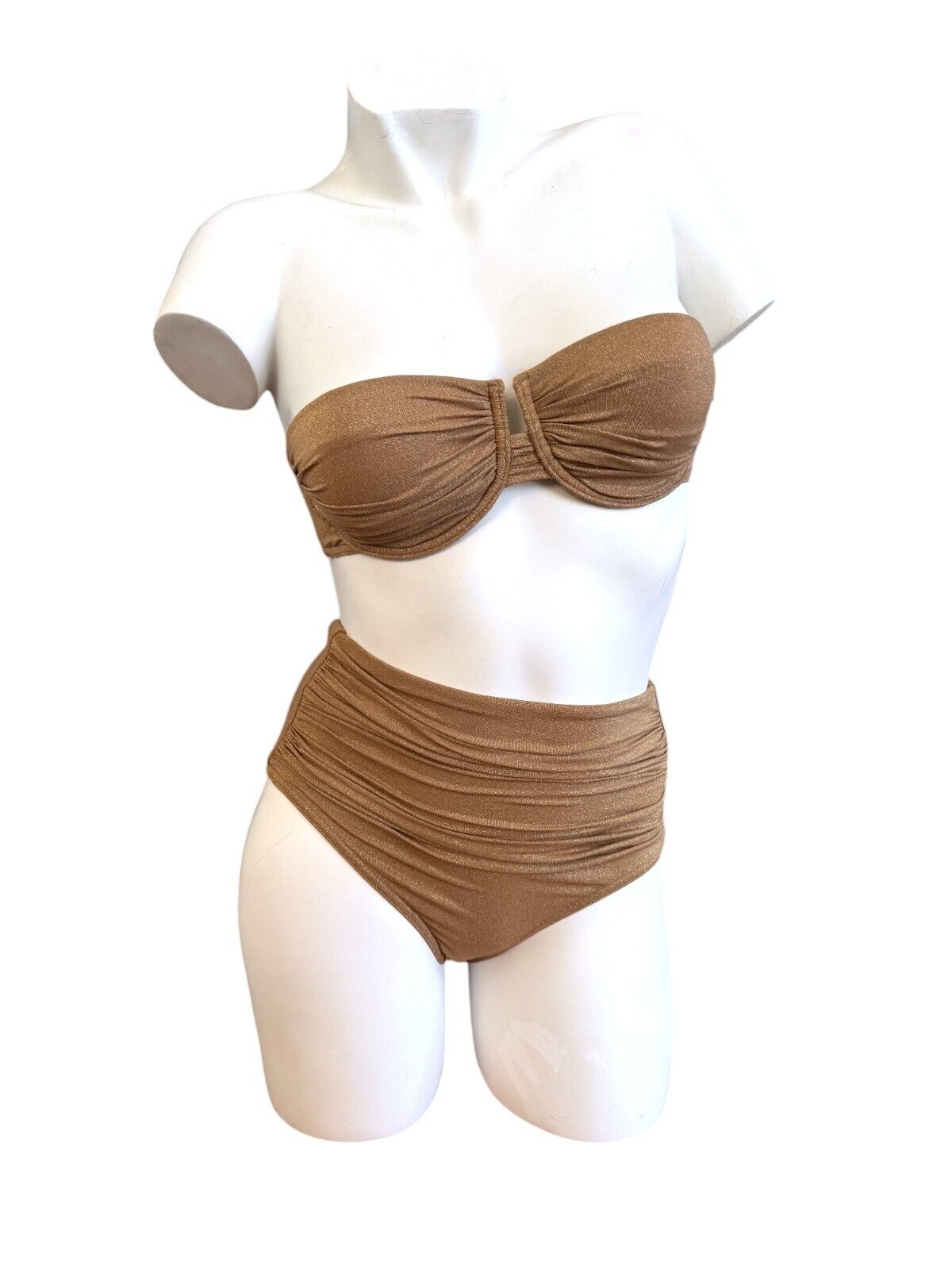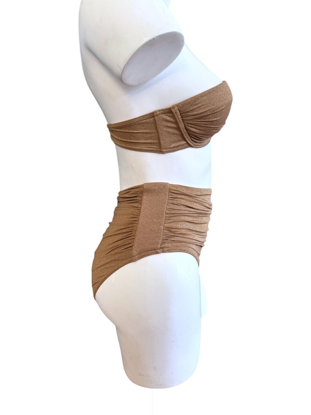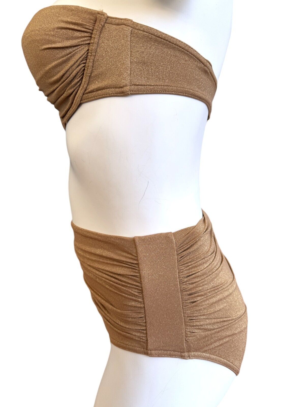 This is a lovely metallic gold bikini from Zimmermann's 2024 collection. It is designed with ruched details and a shimmery effect. The bikini is sold as a set and includes a strapless underwire top and high-rise bottoms.