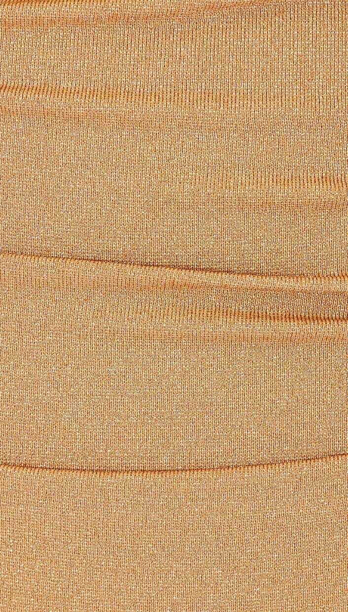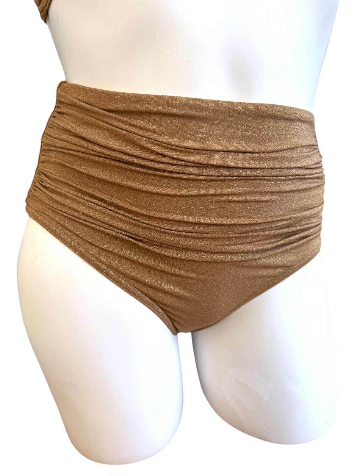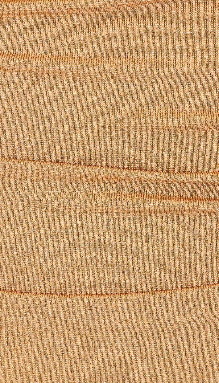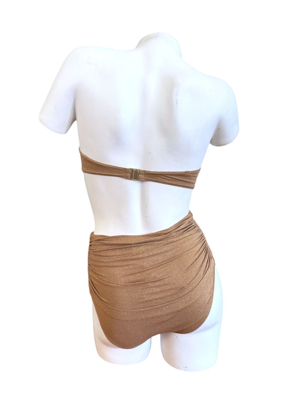This is a lovely metallic gold bikini from Zimmermann's 2024 collection. It is designed with ruched details and a shimmery effect. The bikini is sold as a set and includes a strapless underwire top and high-rise bottoms.