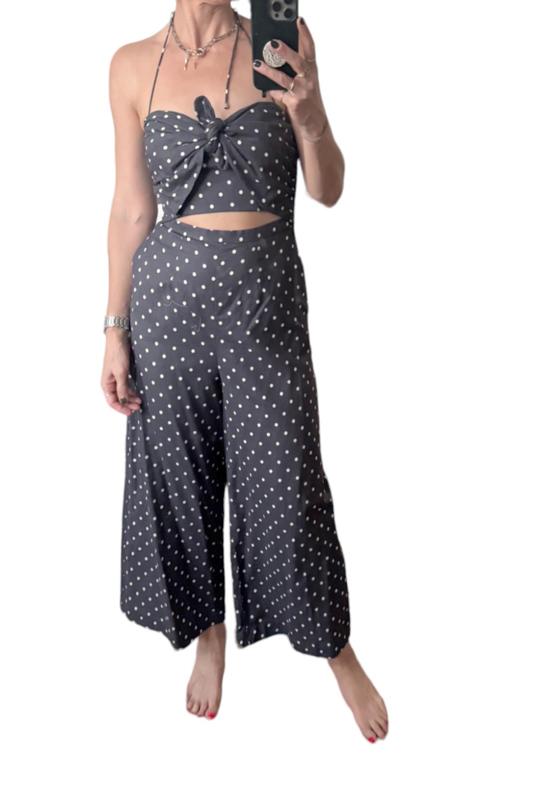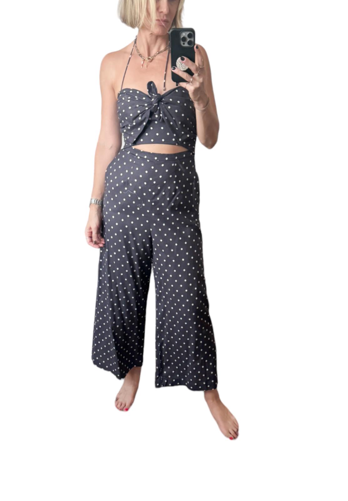 This listing sells a much sought-after jumpsuit from several seasons ago. It is a wide-leg jumpsuit that fits high in the waist. The bodice portion features a cutout with a tie detail at the bust. The bodice is boned. An optional halterneck strap for support is also available. If you don't wish to wear it with the strap, it can easily be tucked into the jumpsuit.