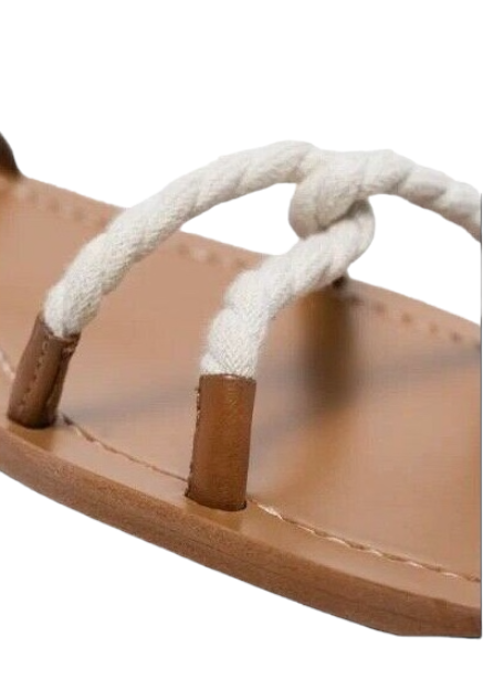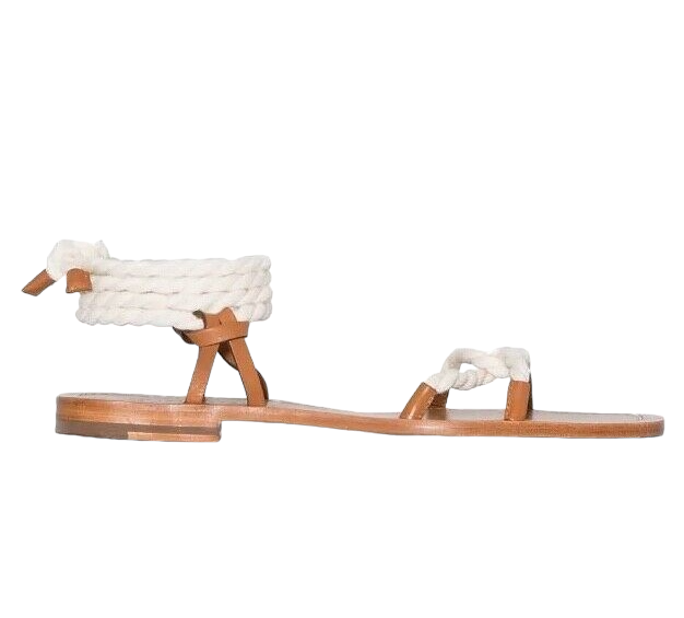 The shoes are flat sandals with a leather footbed, rope detail and wrap-around ankle straps. One shoe still has the sticker underneath the sole, but the other doesn't. It has never been worn but has been tried on ;)