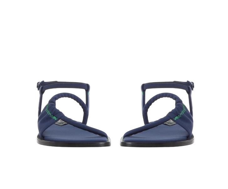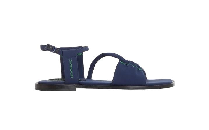 The Scuba Flat Sandal by Zimmermann is a gorgeous, Italian-made flat sandal constructed from scuba material known as Neoprene fabric. It is a style that was launched in their recent 2023 collection.