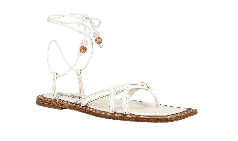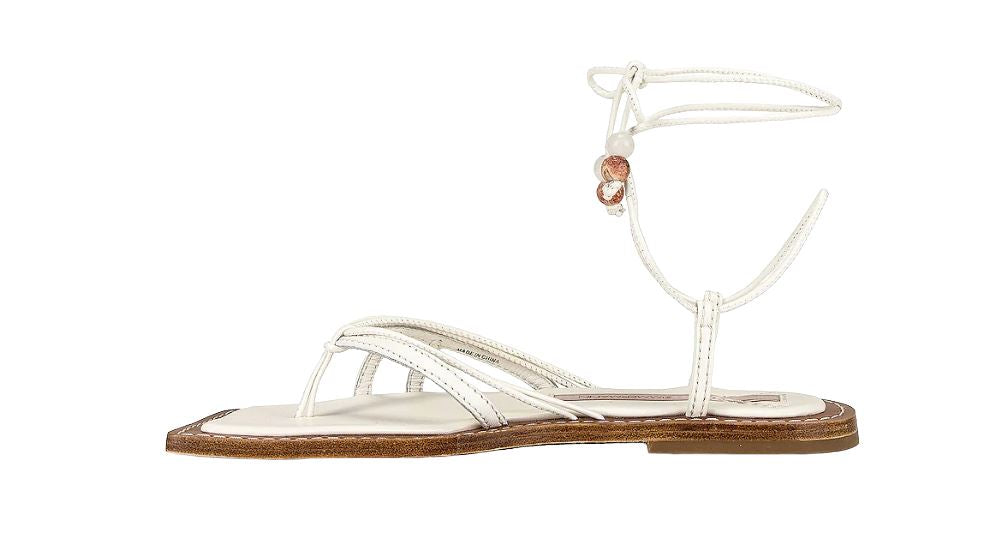 These shoes hale from their Resort Swim '22 Collection. They are flat leather sandals featuring a toe thong and self-tie ankle straps with beaded ends.