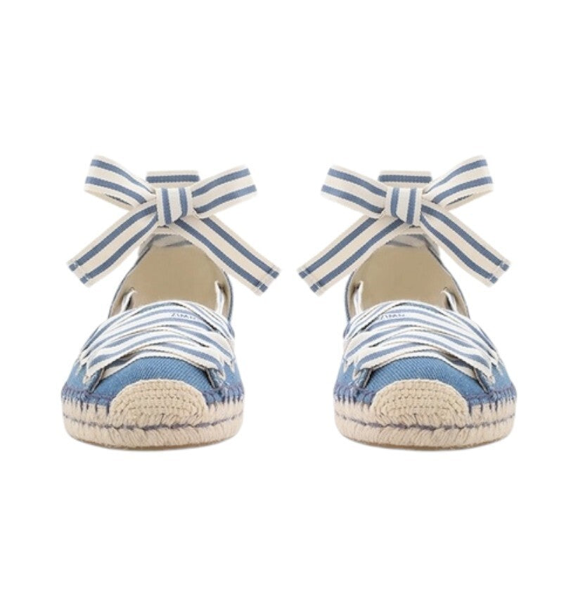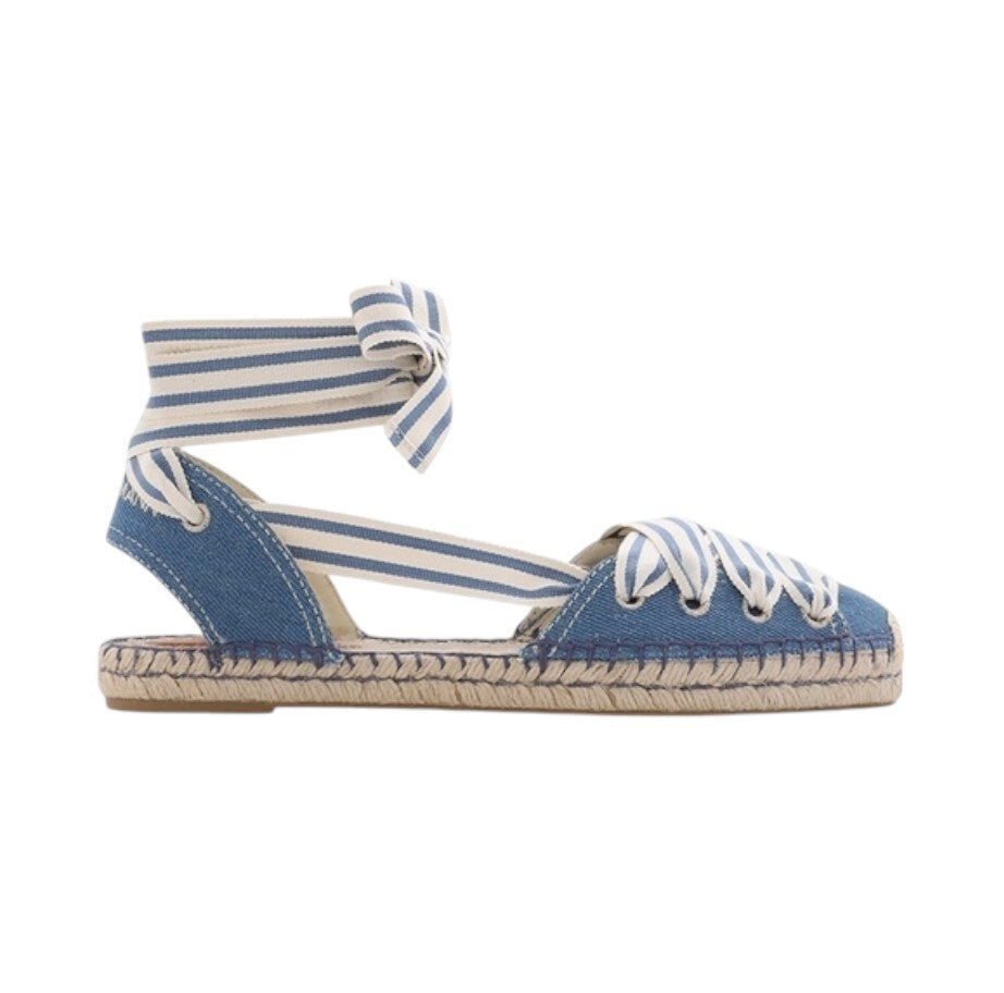 A pair of gorgeous flat Espadrilles made of denim blue cotton fabric and ankle straps.