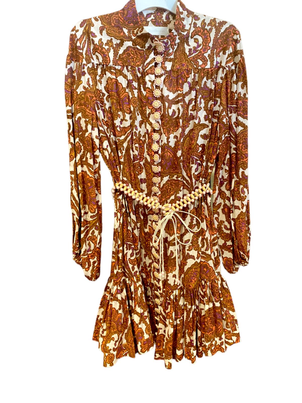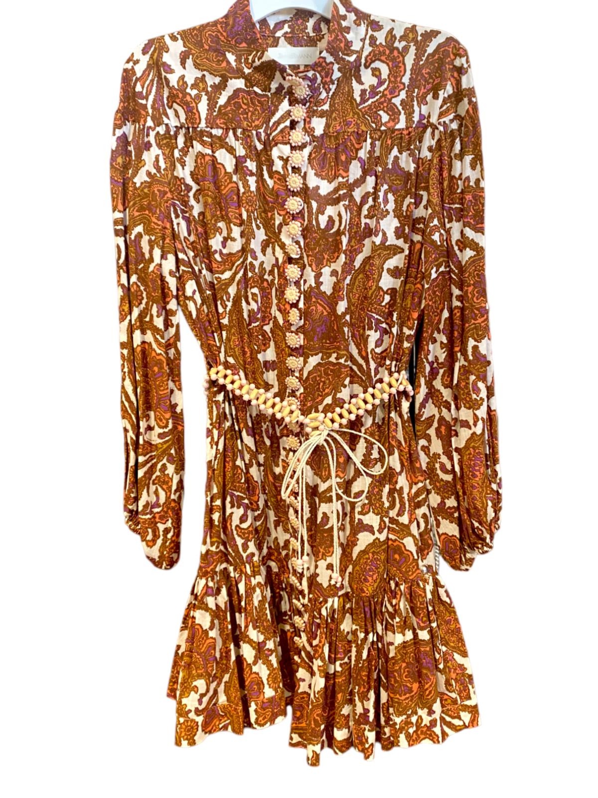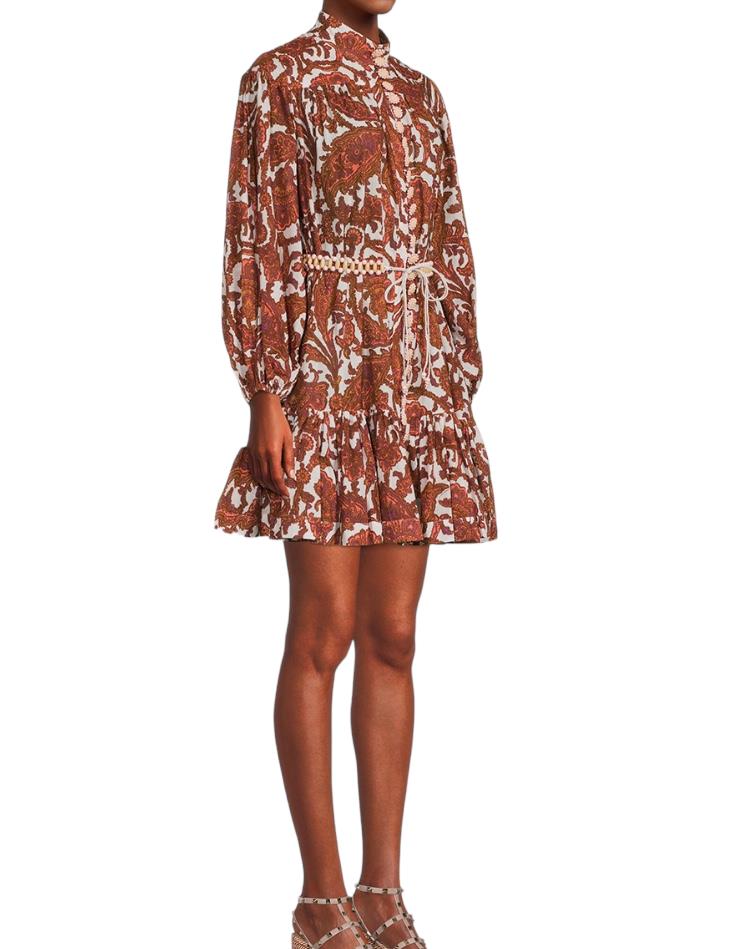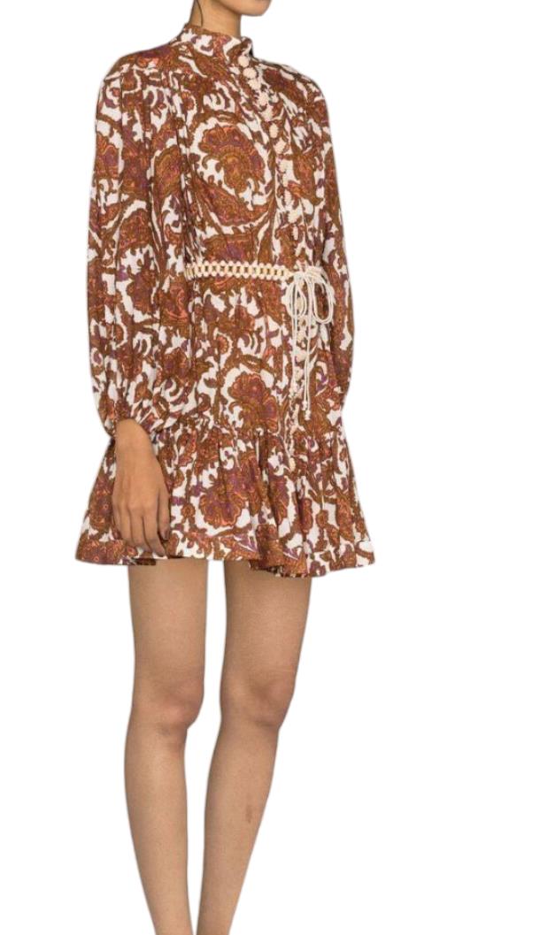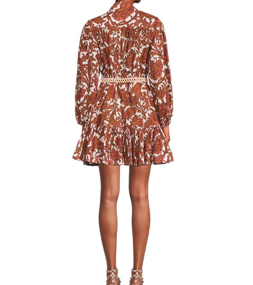 This is a gorgeous dress from the latest 2023 collection by Zimmermann. It features a cotton mini dress with a coral-toned paisley print, accentuated by blouson sleeves and a frilled hem. The dress is cut with a dropped waist although it is cinched in with an optional removable belt.
