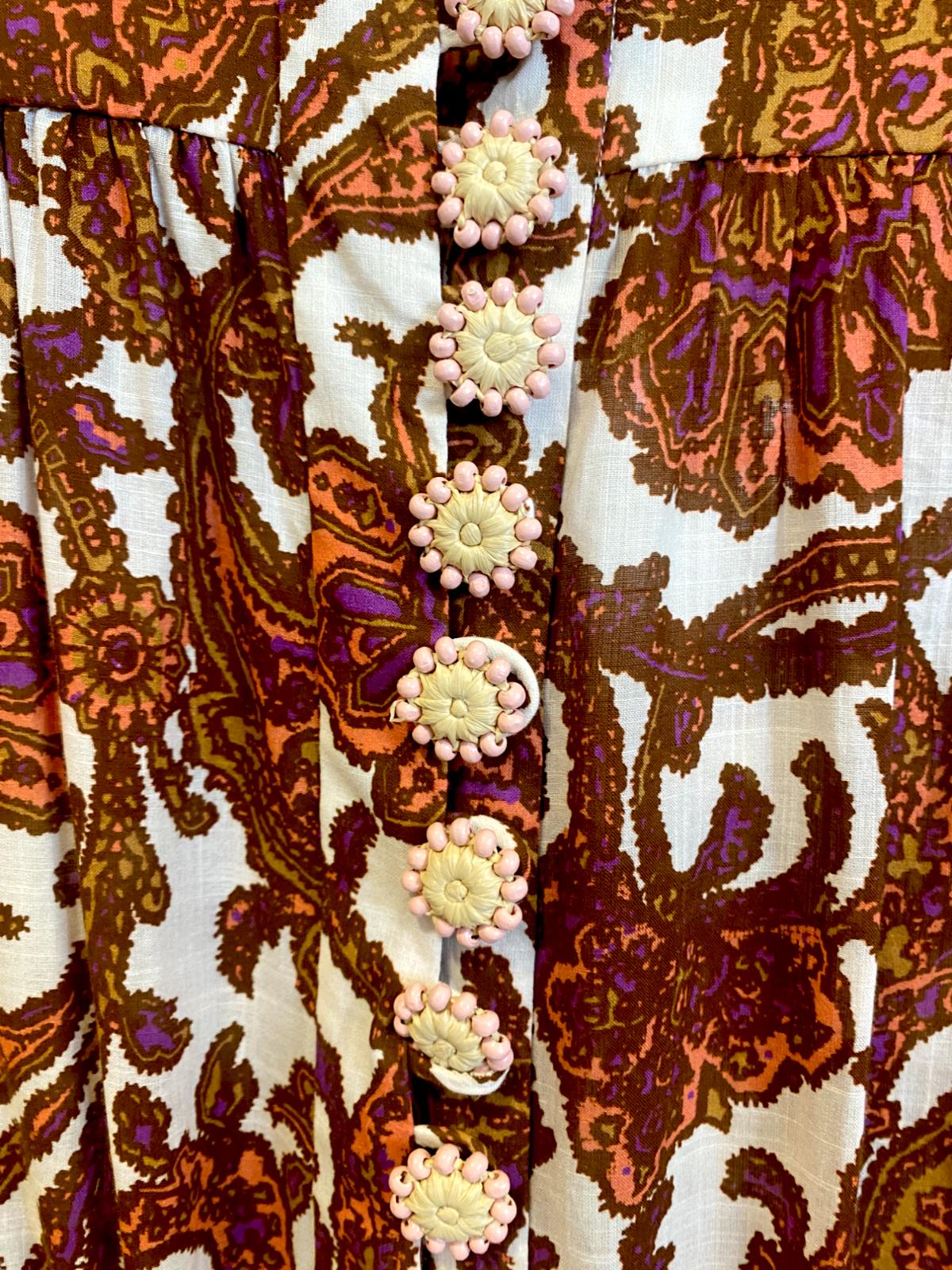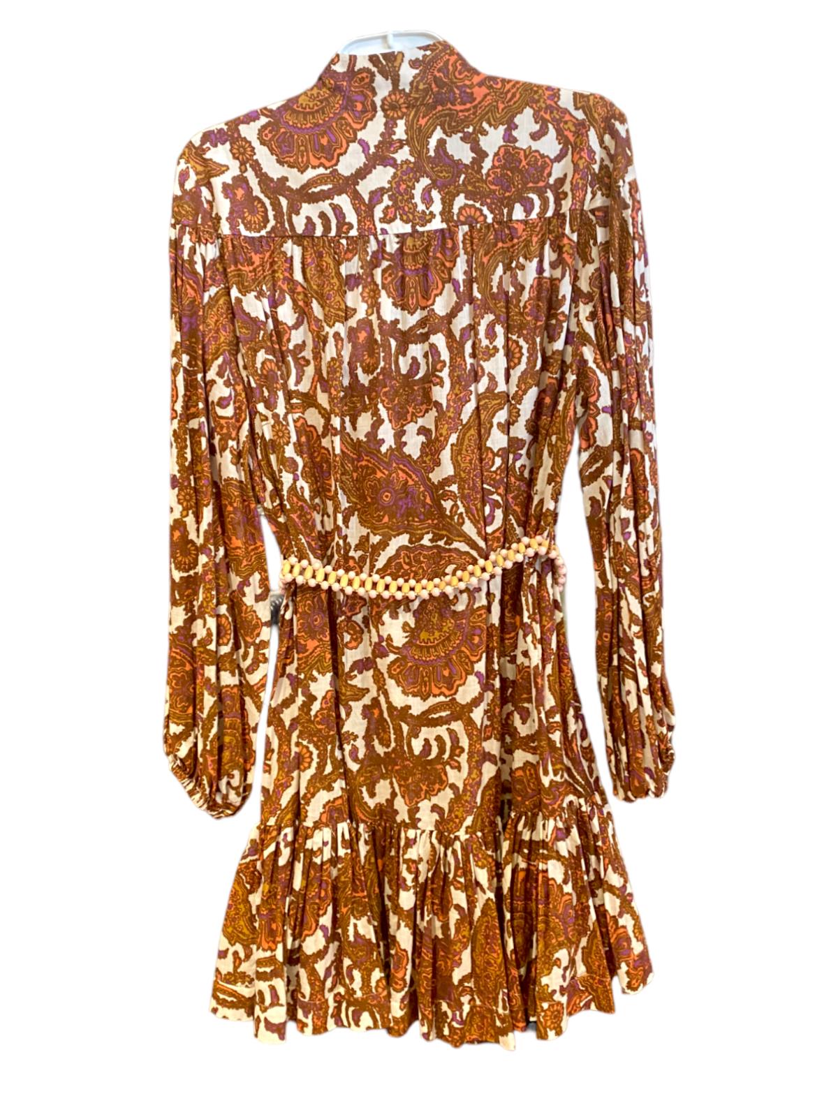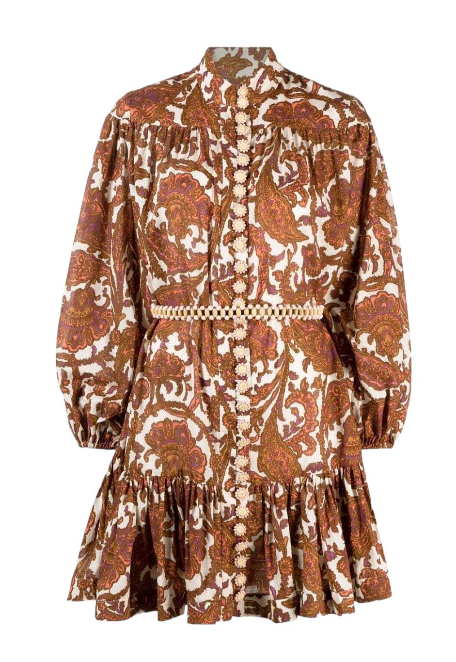 This is a gorgeous dress from the latest 2023 collection by Zimmermann. It features a cotton mini dress with a coral-toned paisley print, accentuated by blouson sleeves and a frilled hem. The dress is cut with a dropped waist although it is cinched in with an optional removable belt.