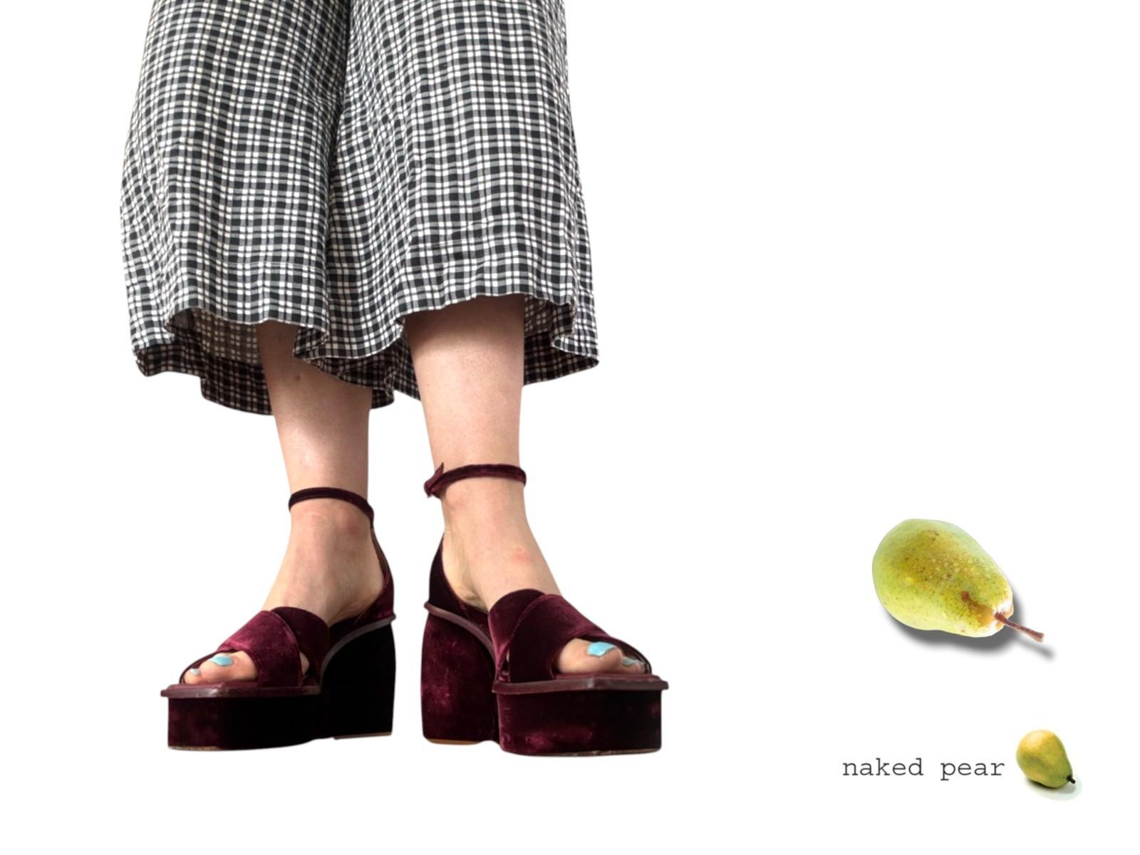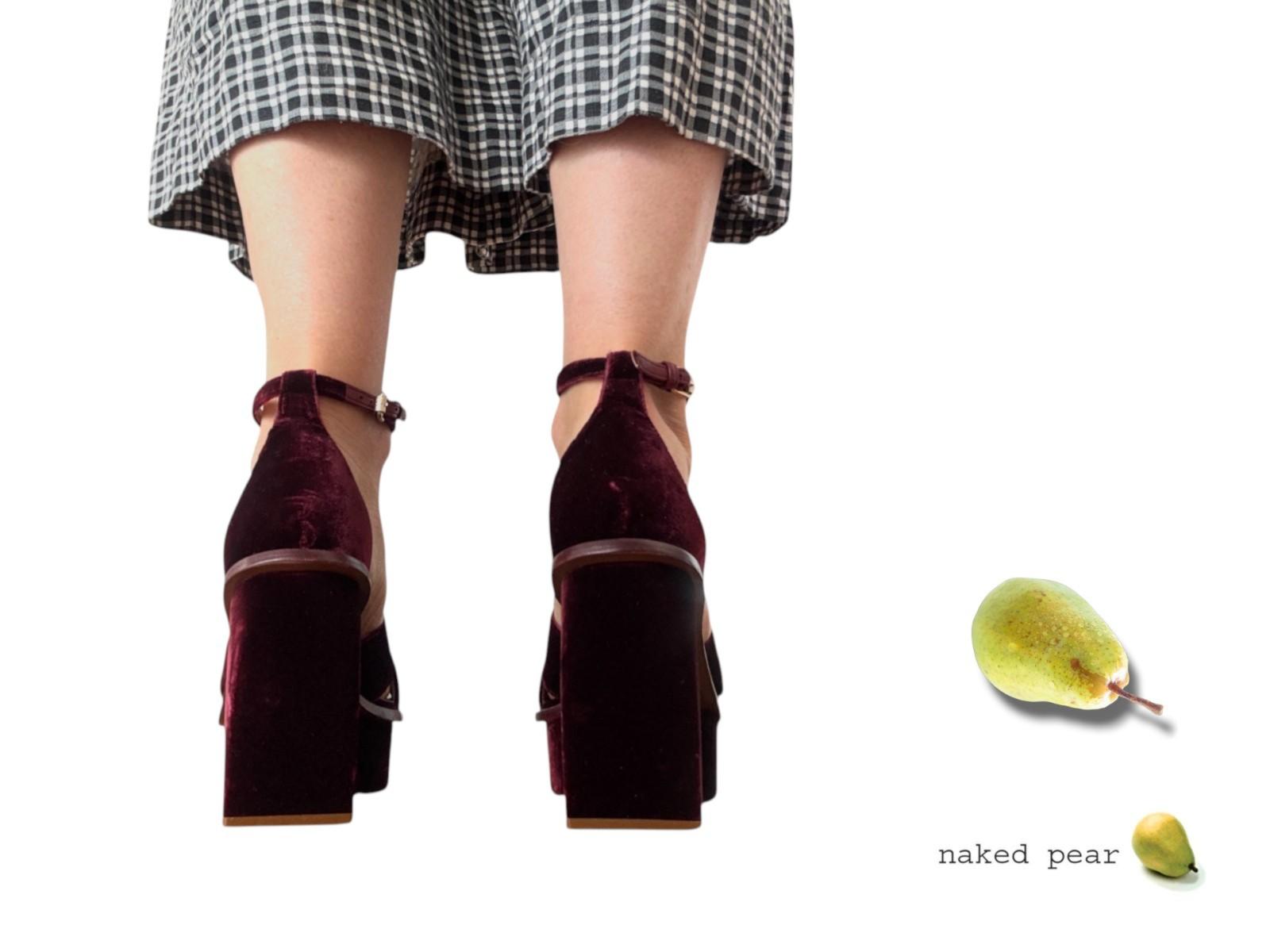 The Velvet Platform Sandal in Burgundy from the Zimmermann Fall 2022 Collection, Stargazer. A leather strappy heel adorned in velvet, finished with an adjustable buckle closure and topstitch detailing.