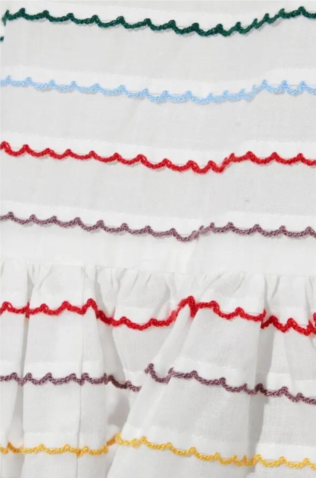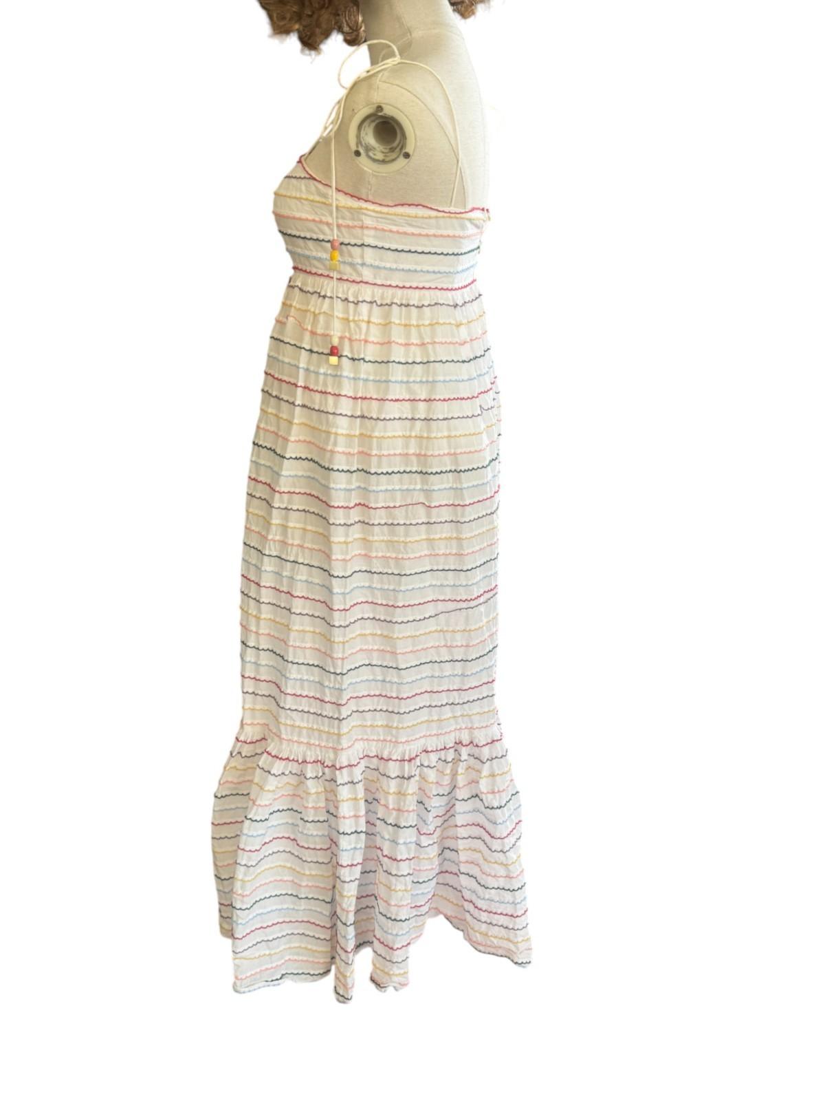 This is an incredible dress by Zimmermann's Zinnia collection from several years back! It features a cotton-voile embroidered dress with gathered ties at the shoulders. The dress features an empire silhouette and rainbow-coloured scalloped detailing throughout. A concealed hook-and-zip fastening at the back keeps it well-fitted and beautiful to wear.